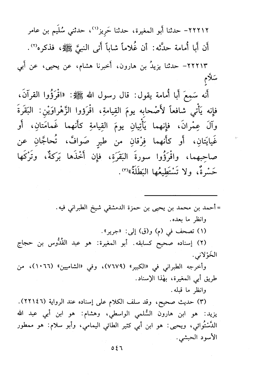 ٢٢٢١٣ - حَدَّثَنَا يَزِيدُ بْنُ هَارُونَ، أَخْبَرَنَا هِشَامٌ، عَنْ يَحْيَى، عَنْ أَبِي سَلَّامٍ، أَنَّهُ سَمِعَ أَبَا أُمَامَةَ يَقُولُ: قَالَ رَسُولُ اللهِ صَلَّى اللهُ عَلَيْهِ وَسَلَّمَ: " اقْرَءُوا الْقُرْآنَ؛ فَإِنَّهُ يَأْتِي شَافِعًا لِأَصْحَابِهِ يَوْمَ الْقِيَامَةِ، اقْرَءُوا الزَّهْرَاوَيْنِ: الْبَقَرَةَ وَآلَ عِمْرَانَ؛ فَإِنَّهُمَا يَأْتِيَانِ يَوْمَ الْقِيَامَةِ كَأَنَّهُمَا غَمَامَتَانِ أَوْ غَيَايَتَانِ أَوْ كَأَنَّهُمَا فِرْقَانِ مِنْ طَيْرٍ صَوَافَّ، تُحَاجَّانِ عَنْ صَاحِبِهِمَا، وَاقْرَءُوا سُورَةَ الْبَقَرَةِ؛ فَإِنَّ أَخْذَهَا بَرَكَةٌ وَتَرْكَهَا حَسْرَةٌ وَلَا تَسْتَطِيعُهَا الْبَطَلَةُ " (٣)