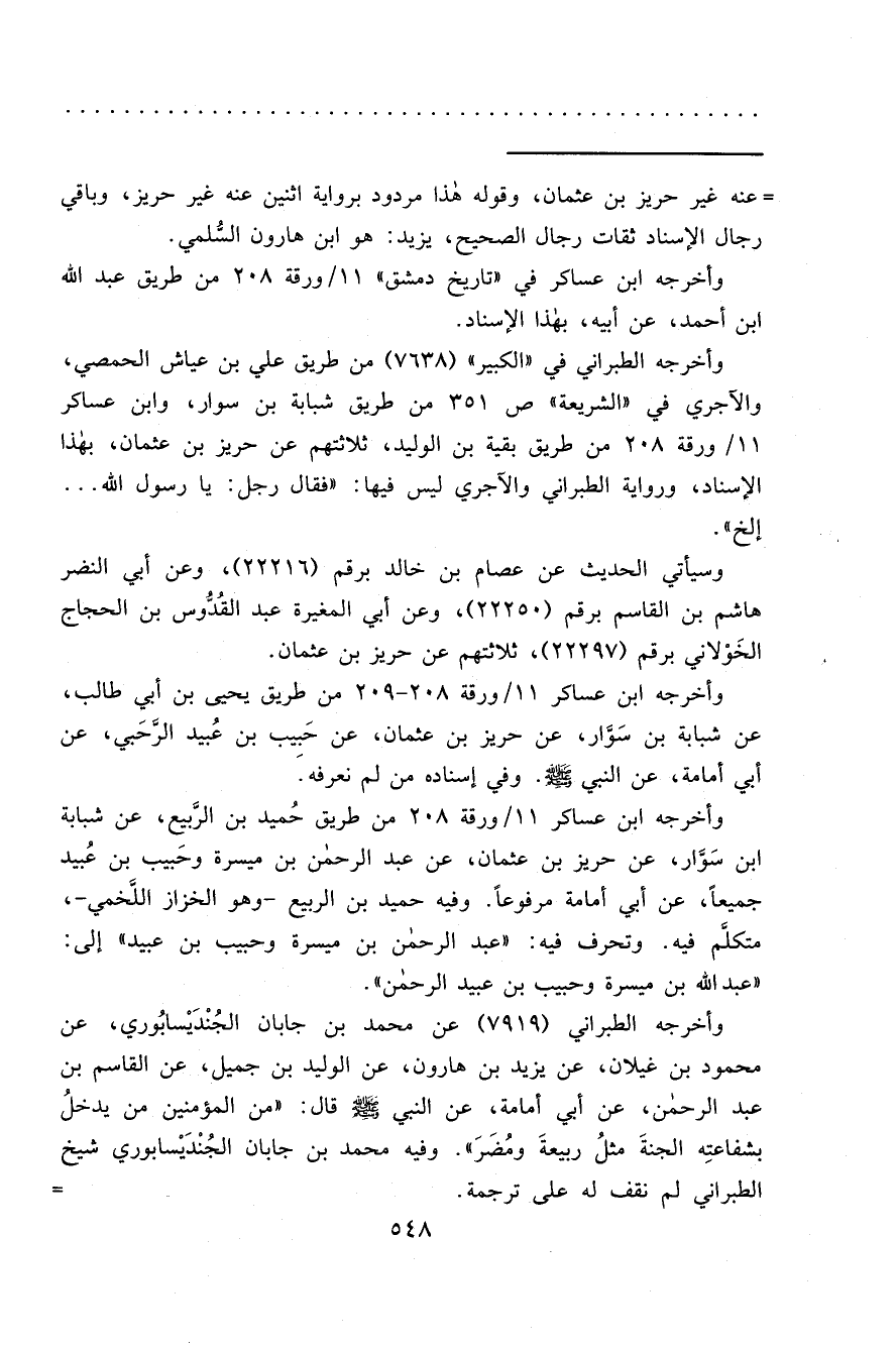 وأخرجه ابن عساكر ١١/ورقة ٢٠٨-٢٠٩ من طريق يحيى بن أبي طالب، عن شبابة بن سَوَّار، عن حريز بن عثمان، عن حَبِيب بن عُبيد الرَّحَبي، عن أبي أمامة، عن النبي صَلَّى اللهُ عَلَيْهِ وَسَلَّمَ. وفي إسناده من لم نعرفه.