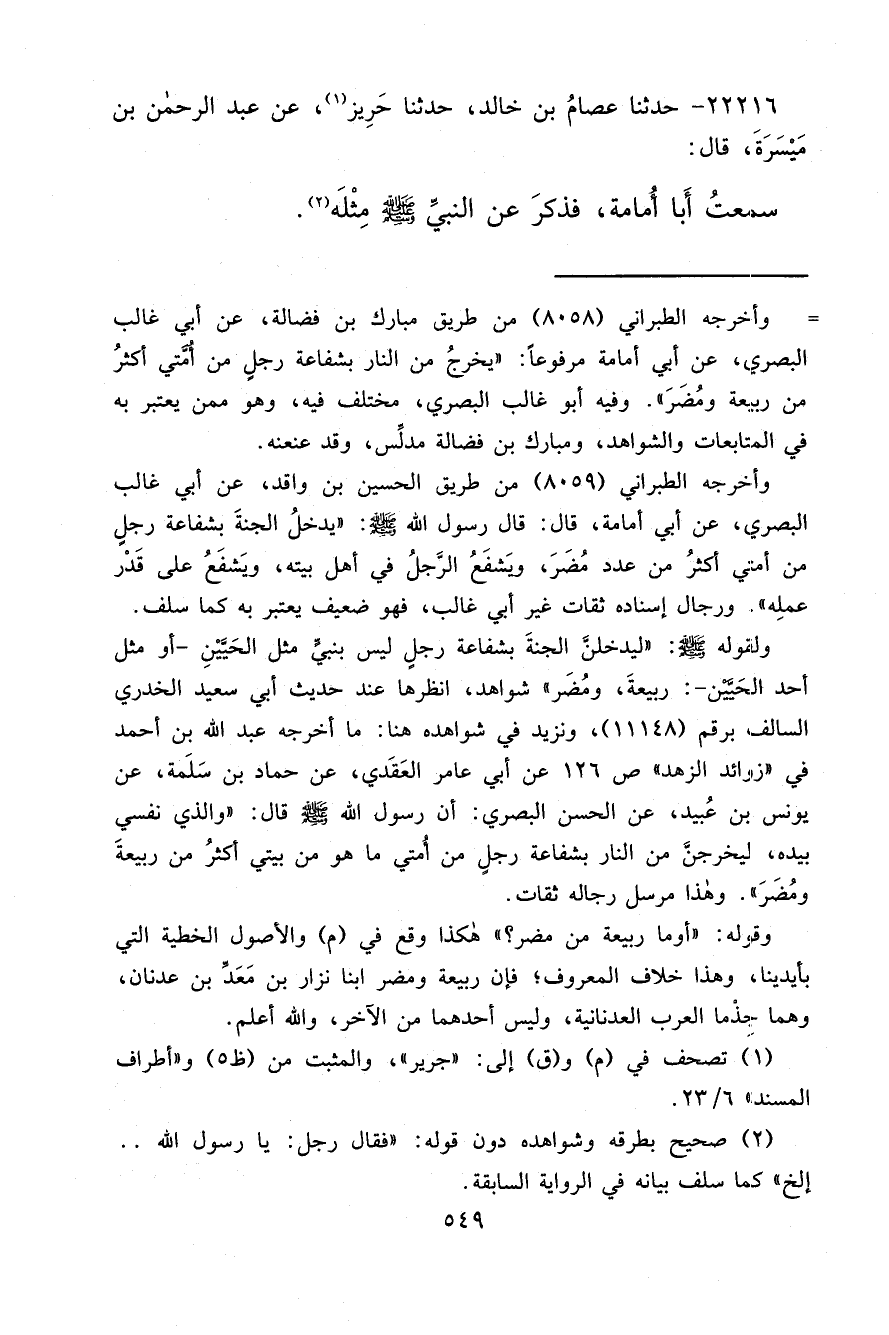 ولقوله صَلَّى اللهُ عَلَيْهِ وَسَلَّمَ: "ليدخلنَّ الجنةَ بشفاعة رجلٍ ليس بنبيٍّ مثل الحَيَّيْنِ -أو مثل أحد الحَيَّيْن-: ربيعةَ، ومُضَر" شواهد، انظرها عند حديث أبي سعيد الخدري السالف برقم (١١١٤٨) ، ونزيد في شواهده هنا: ما أخرجه عبد الله بن أحمد في "زوائد الزهد" ص ١٢٦ عن أبي عامر العَقَدي، عن حماد بن سَلَمة، عن يونس بن عُبيد، عن الحسن البصري: أن رسول الله صَلَّى اللهُ عَلَيْهِ وَسَلَّمَ قال: "والذي نفسي بيده، ليخرجنَّ من النار بشفاعة رجلٍ من أُمتي ما هو من بيتي أكثرُ من ربيعةَ ومُضَرَ". وهذا مرسل رجاله ثقات.