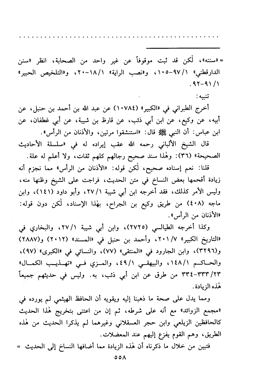 قلنا: نعم إسناده صحيح، لكن قوله: "الأذنان من الرأس" مما نجزم أنه زيادة أقحمها بعض النساخ في متن الحديث، فراجت على الشيخ وظنها منه، وليس الأمر كذلك، فقد أخرجه ابن أبي شيبة ١/٢٧، وأبو داود (١٤١) ، وابن ماجه (٤٠٨) من طريق وكيع بن الجراح، بهذا الإسناد، لكن دون قوله: "الأذنان من الرأس".