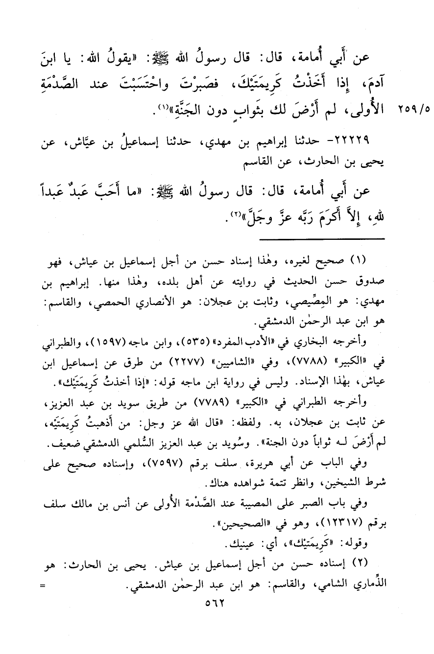 عَنْ أَبِي أُمَامَةَ قَالَ: قَالَ رَسُولُ اللهِ صَلَّى اللهُ عَلَيْهِ وَسَلَّمَ يَقُولُ اللهُ: " يَا ابْنَ آدَمَ إِذَا أَخَذْتُ كَرِيمَتَيْكَ فَصَبَرْتَ، وَاحْتَسَبْتَ عِنْدَ الصَّدْمَةِ الْأُولَى لَمْ أَرْضَ لَكَ بِثَوَابٍ دُونَ الْجَنَّةِ " (١)