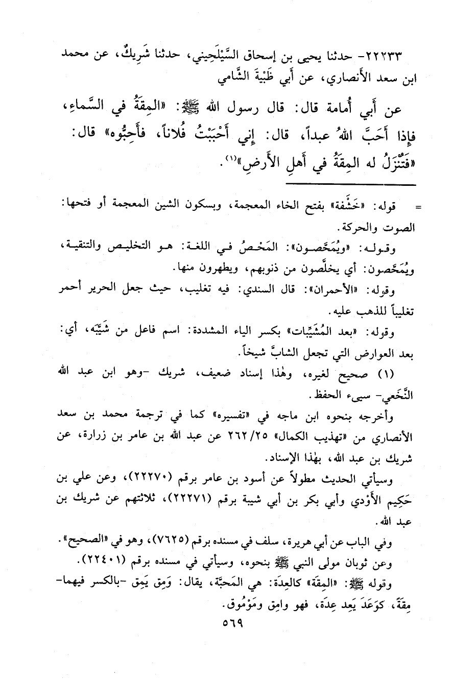 ٢٢٢٣٣ - حَدَّثَنَا يَحْيَى بْنُ إِسْحَاقَ السِّيلَحِينِيُّ، حَدَّثَنَا شَرِيكٌ، عَنْ مُحَمَّدِ بْنِ سَعْدٍ الْأَنْصَارِيِّ، عَنْ أَبِي ظَبْيَةَ الشَّامِيِّ، عَنْ أَبِي أُمَامَةَ قَالَ: قَالَ رَسُولُ اللهِ صَلَّى اللهُ عَلَيْهِ وَسَلَّمَ: " الْمِقَةُ فِي السَّمَاءِ، فَإِذَا أَحَبَّ اللهُ عَبْدًا قَالَ: إِنِّي أَحْبَبْتُ فُلَانًا فَأَحِبُّوهُ ". قَالَ: " فَتَنْزِلُ لَهُ الْمِقَةُ فِي أَهْلِ الْأَرْضِ " (١)