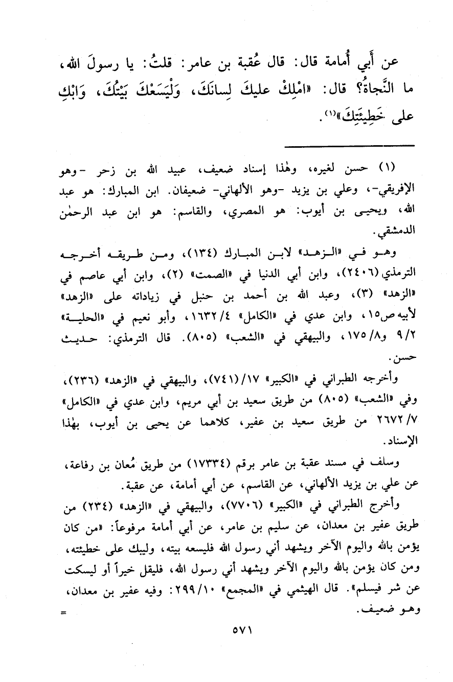 عَنْ أَبِي أُمَامَةَ قَالَ: قَالَ عُقْبَةُ بْنُ عَامِرٍ قُلْتُ: يَا رَسُولَ اللهِ، مَا النَّجَاةُ؟ قَالَ: " أَمْلِكْ عَلَيْكَ لِسَانَكَ، وَلْيَسَعْكَ بَيْتُكَ، وَابْكِ عَلَى خَطِيئَتِكَ " (١)