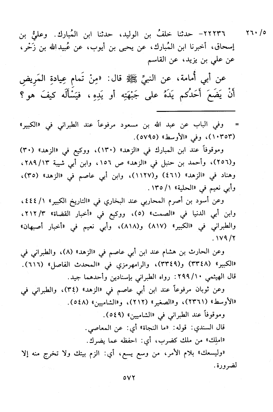 ٢٢٢٣٦ - حَدَّثَنَا خَلَفُ بْنُ الْوَلِيدِ، حَدَّثَنَا ابْنُ الْمُبَارَكِ، وَعَلِيُّ بْنُ إِسْحَاقَ، أَخْبَرَنَا ابْنُ الْمُبَارَكِ، عَنْ يَحْيَى بْنِ أَيُّوبَ، عَنْ عُبَيْدِ اللهِ بْنِ زَحْرٍ، عَنْ عَلِيِّ بْنِ يَزِيدَ، عَنِ الْقَاسِمِ، عَنْ أَبِي أُمَامَةَ، عَنِ النَّبِيِّ صَلَّى اللهُ عَلَيْهِ وَسَلَّمَ قَالَ: " مِنْ تَمَامِ عِيَادَةِ الْمَرِيضِ أَنْ يَضَعَ أَحَدُكُمْ يَدَهُ عَلَى جَبْهَتِهِ، أَوْ يَدِهِ، فَيَسْأَلُهُ كَيْفَ هُوَ؟