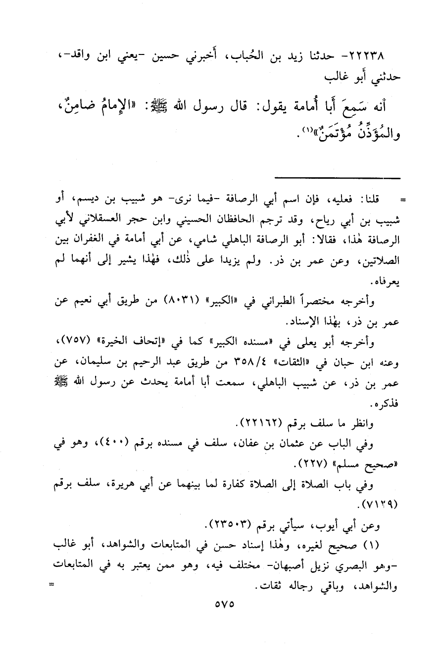٢٢٢٣٨ - حَدَّثَنَا زَيْدُ بْنُ الْحُبَابِ، أَخْبَرَنِي حُسَيْنٌ يَعْنِي ابْنَ وَاقِدٍ، حَدَّثَنِي أَبُو غَالِبٍ، أَنَّهُ سَمِعَ أَبَا أُمَامَةَ يَقُولُ: قَالَ رَسُولُ اللهِ صَلَّى اللهُ عَلَيْهِ وَسَلَّمَ: " الْإِمَامُ ضَامِنٌ وَالْمُؤَذِّنُ مُؤْتَمَنٌ " (١)