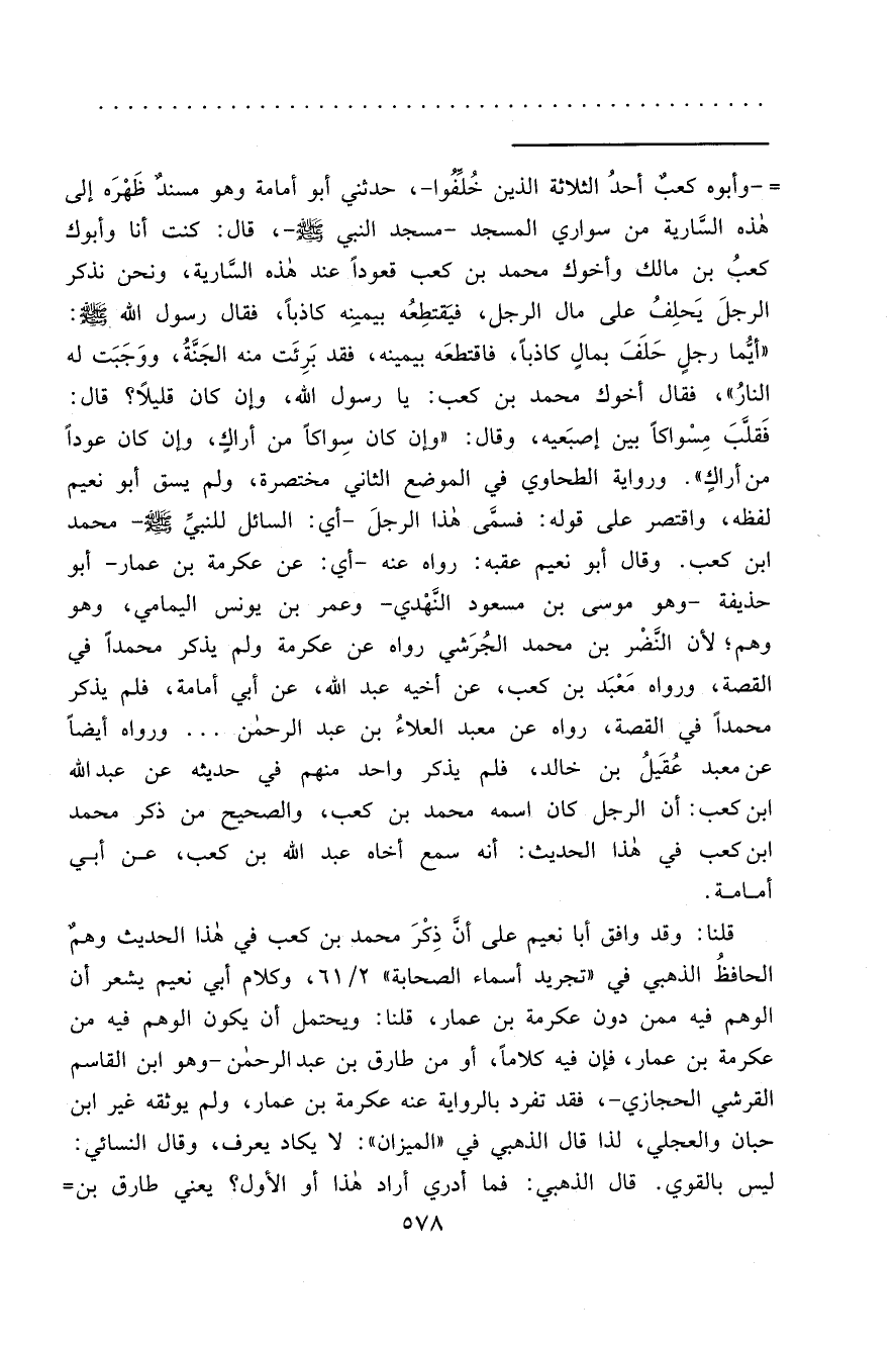 = -وأبوه كعبٌ أحدُ الثلاثة الذين خُلِّفُوا-، حدثني أبو أمامة وهو مسندٌ ظَهْرَه إلى هذه السَّارية من سواري المسجد -مسجد النبي صَلَّى اللهُ عَلَيْهِ وَسَلَّمَ-، قال: كنت أنا وأبوك كعبُ بن مالك وأخوك محمد بن كعب قعوداً عند هذه السَّارية، ونحن نذكر الرجلَ يَحلِفُ على مال الرجل، فيَقتطِعُه بيمينه كاذباً، فقال رسول الله صَلَّى اللهُ عَلَيْهِ وَسَلَّمَ: "أيُّما رجلٍ حَلَفَ بمالٍ كاذباً، فاقتطعَه بيمينه، فقد بَرِئَت منه الجَنَّةُ، ووَجَبَت له النارُ"، فقال أخوك محمد بن كعب: يا رسول الله، وإن كان قليلاً؟ قال: فَقلََّبَ مِسْواكاً بين إصبَعيه، وقال: "وإن كان سِواكاً من أراكٍ، وإن كان عوداً من أراكٍ". ورواية الطحاوي في الموضع الثاني مختصرة، ولم يسق أبو نعيم لفظه، واقتصر على قوله: فسمَّى هذا الرجلَ -أي: السائل للنبيِّ صَلَّى اللهُ عَلَيْهِ وَسَلَّمَ- محمد ابن كعب. وقال أبو نعيم عقبه: رواه عنه -أي: عن عكرمة بن عمار- أبو حذيفة -وهو موسى بن مسعود النَّهْدي- وعمر بن يونس اليمامي، وهو وهم؛ لأن النَّضْر بن محمد الجُرَشي رواه عن عكرمة ولم يذكر محمداً في القصة، ورواه مَعْبَد بن كعب، عن أخيه عبد الله، عن أبي أمامة، فلم يذكر محمداً في القصة، رواه عن معبد العلاءُ بن عبد الرحمن ... ورواه أيضاً عن معبد عُقَيلُ بن خالد، فلم يذكر واحد منهم في حديثه عن عبد الله ابن كعب: أن الرجل كان اسمه محمد بن كعب، والصحيح من ذكر محمد ابن كعب في هذا الحديث: أنه سمع أخاه عبد الله بن كعب، عن أبي أمامة.