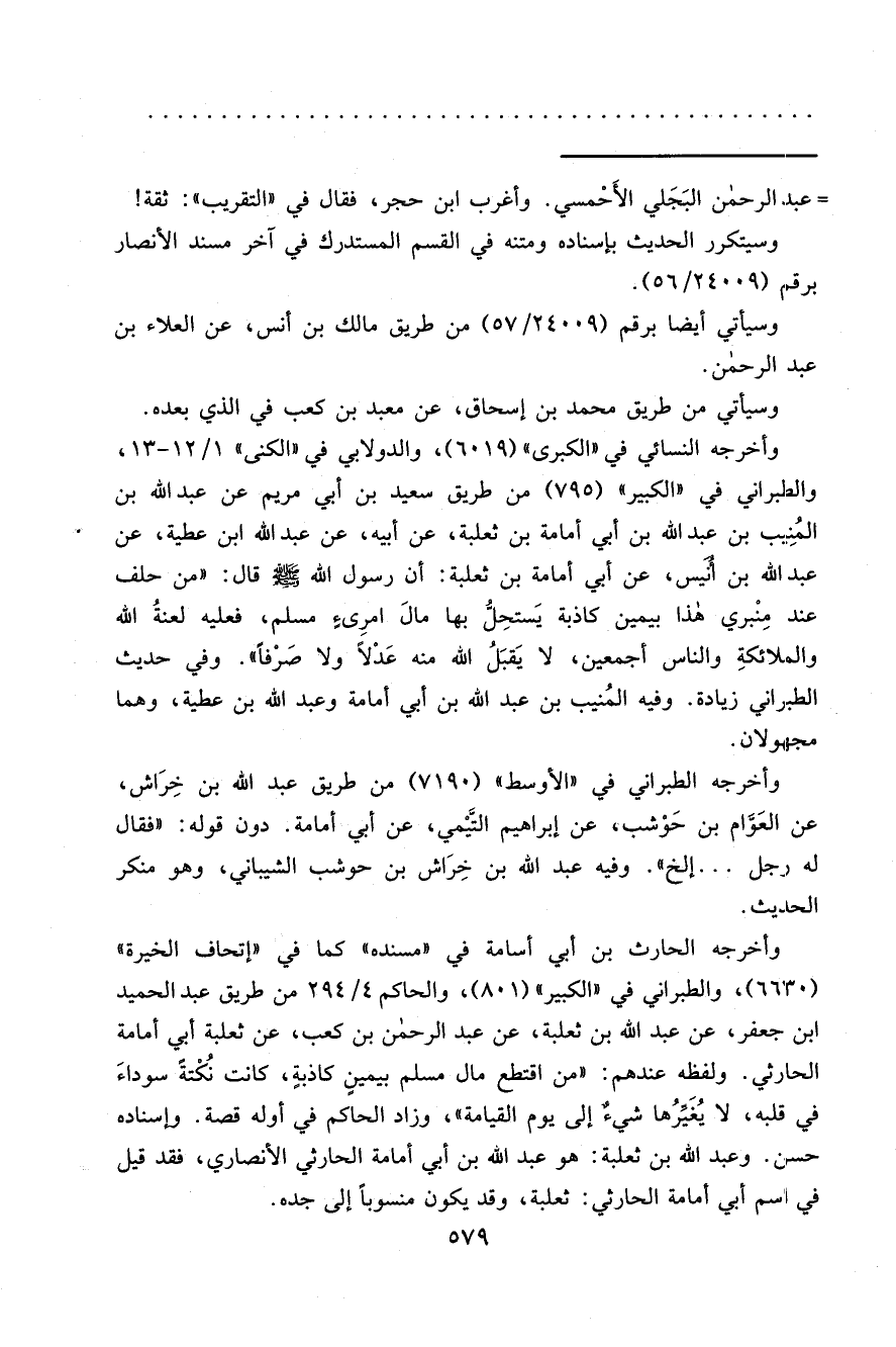 وأخرجه الحارث بن أبي أسامة في "مسنده" كما في "إتحاف الخيرة" (٦٦٣٠) ، والطبراني في "الكبير" (٨٠١) ، والحاكم ٤/٢٩٤ من طريق عبد الحميد ابن جعفر، عن عبد الله بن ثعلبة، عن عبد الرحمن بن كعب، عن ثعلبة أبي أمامة الحارثي. ولفظه عندهم: "من اقتطع مال مسلم بيمينٍ كاذبةٍ، كانت نُكْتةً سوداءَ في قلبه، لا يُغَيِّرُها شيءٌ إلى يوم القيامة"، وزاد الحاكم في أوله قصة. وإسناده حسن. وعبد الله بن ثعلبة: هو عبد الله بن أبي أمامة الحارثي الأنصاري، فقد قيل في اسم أبي أمامة الحارثي: ثعلبة، وقد يكون منسوباً إلى جده.