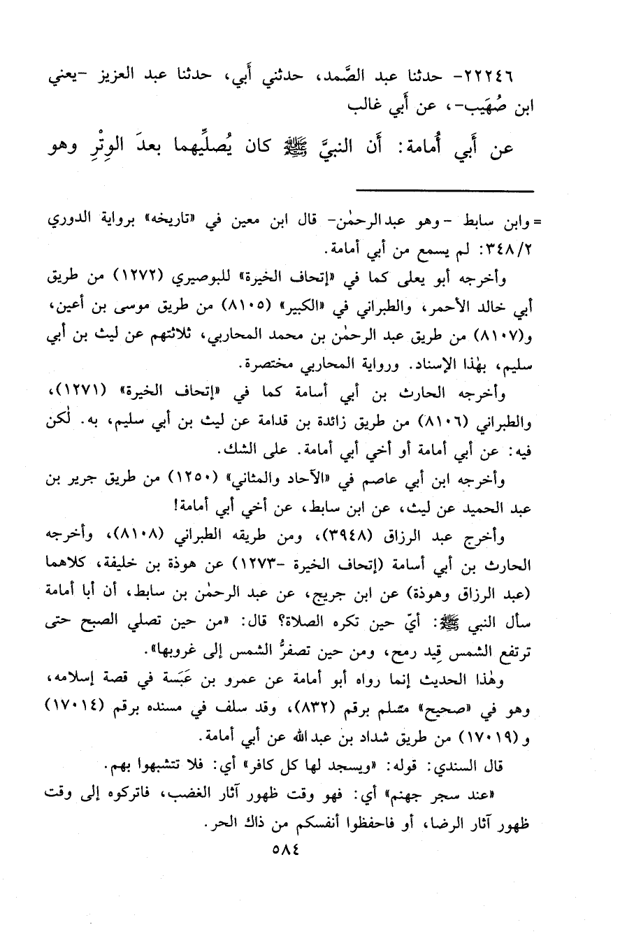 وأخرج عبد الرزاق (٣٩٤٨) ، ومن طريقه الطبراني (٨١٠٨) ، وأخرجه الحارث بن أبي أسامة (إتحاف الخيرة-١٢٧٣) عن هوذة بن خليفة، كلاهما (عبد الرزاق وهوذة) عن ابن جريج، عن عبد الرحمن بن سابط، أن أبا أمامة سأل النبي صَلَّى اللهُ عَلَيْهِ وَسَلَّمَ: أيّ حين تكره الصلاة؟ قال: "من حين تصلي الصبح حتى ترتفع الشمس قِيد رمح، ومن حين تصفرُّ الشمس إلى غروبها".