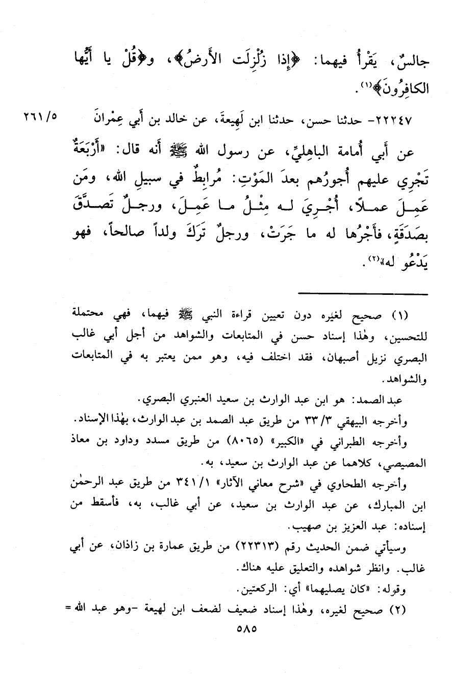 ٢٢٢٤٧ - حَدَّثَنَا حَسَنٌ، حَدَّثَنَا ابْنُ لَهِيعَةَ، عَنْ خَالِدِ بْنِ أَبِي عِمْرَانَ، عَنْ أَبِي أُمَامَةَ الْبَاهِلِيِّ، عَنْ رَسُولِ اللهِ صَلَّى اللهُ عَلَيْهِ وَسَلَّمَ أَنَّهُ قَالَ: " أَرْبَعَةٌ تَجْرِي عَلَيْهِمْ أُجُورُهُمْ بَعْدَ الْمَوْتِ: مُرَابِطٌ فِي سَبِيلِ اللهِ، وَمَنْ عَمِلَ عَمَلًا أُجْرِيَ لَهُ مِثْلُ مَا عَمِلَ، وَرَجُلٌ تَصَدَّقَ بِصَدَقَةٍ فَأَجْرُهَا لَهُ مَا جَرَتْ، وَرَجُلٌ تَرَكَ وَلَدًا صَالِحًا فَهُوَ يَدْعُو لَهُ " (٢)