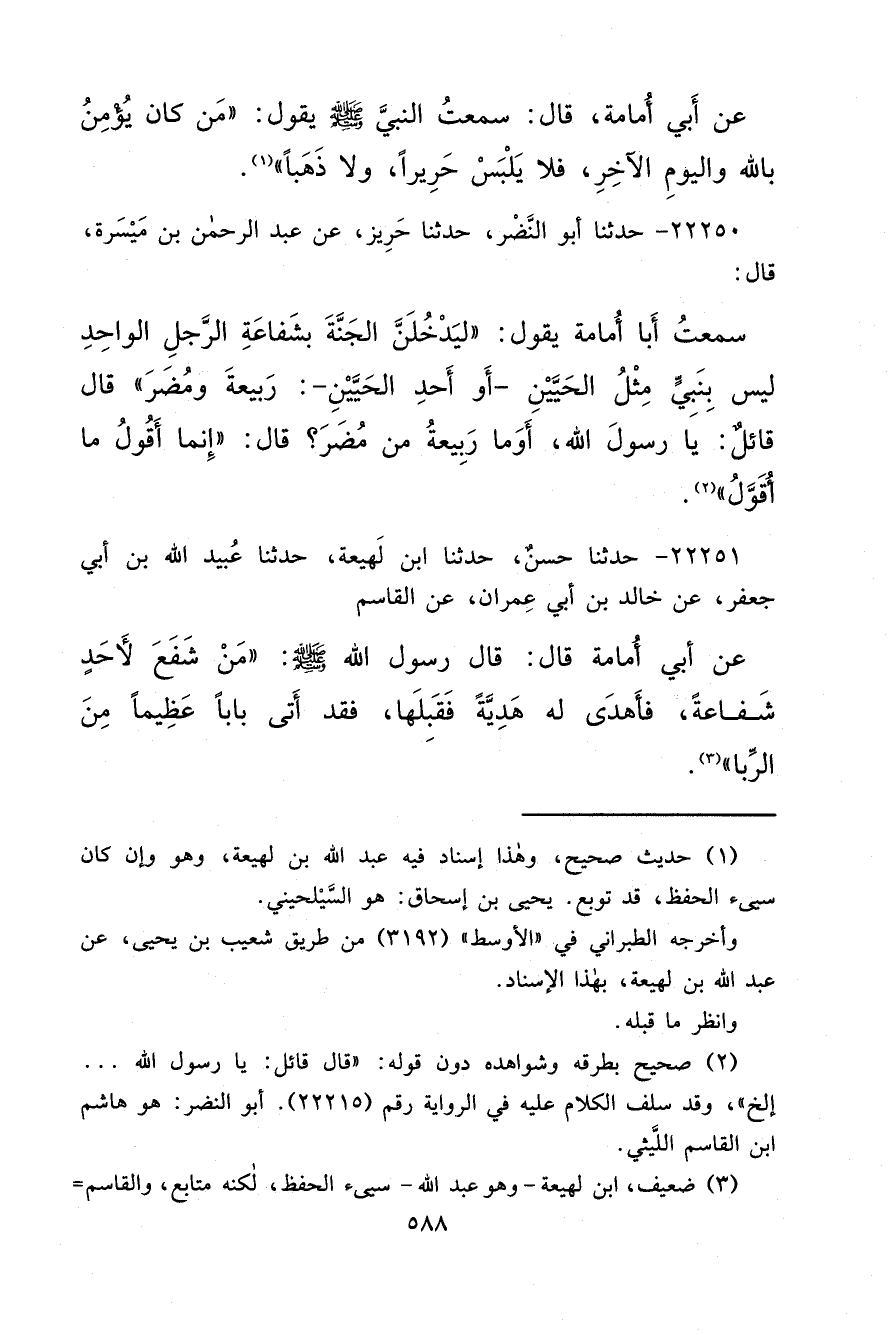 ٢٢٢٥١ - حَدَّثَنَا حَسَنٌ، حَدَّثَنَا ابْنُ لَهِيعَةَ، حَدَّثَنَا عُبَيْدُ اللهِ بْنُ أَبِي جَعْفَرٍ، عَنْ خَالِدِ بْنِ أَبِي عِمْرَانَ، عَنِ الْقَاسِمِ، عَنْ أَبِي أُمَامَةَ قَالَ: قَالَ رَسُولُ اللهِ صَلَّى اللهُ عَلَيْهِ وَسَلَّمَ: " مَنْ شَفَعَ لِأَحَدٍ شَفَاعَةً، فَأَهْدَى لَهُ هَدِيَّةً فَقَبِلَهَا، فَقَدْ أَتَى بَابًا عَظِيمًا مِنَ الرِّبَا " (٣)