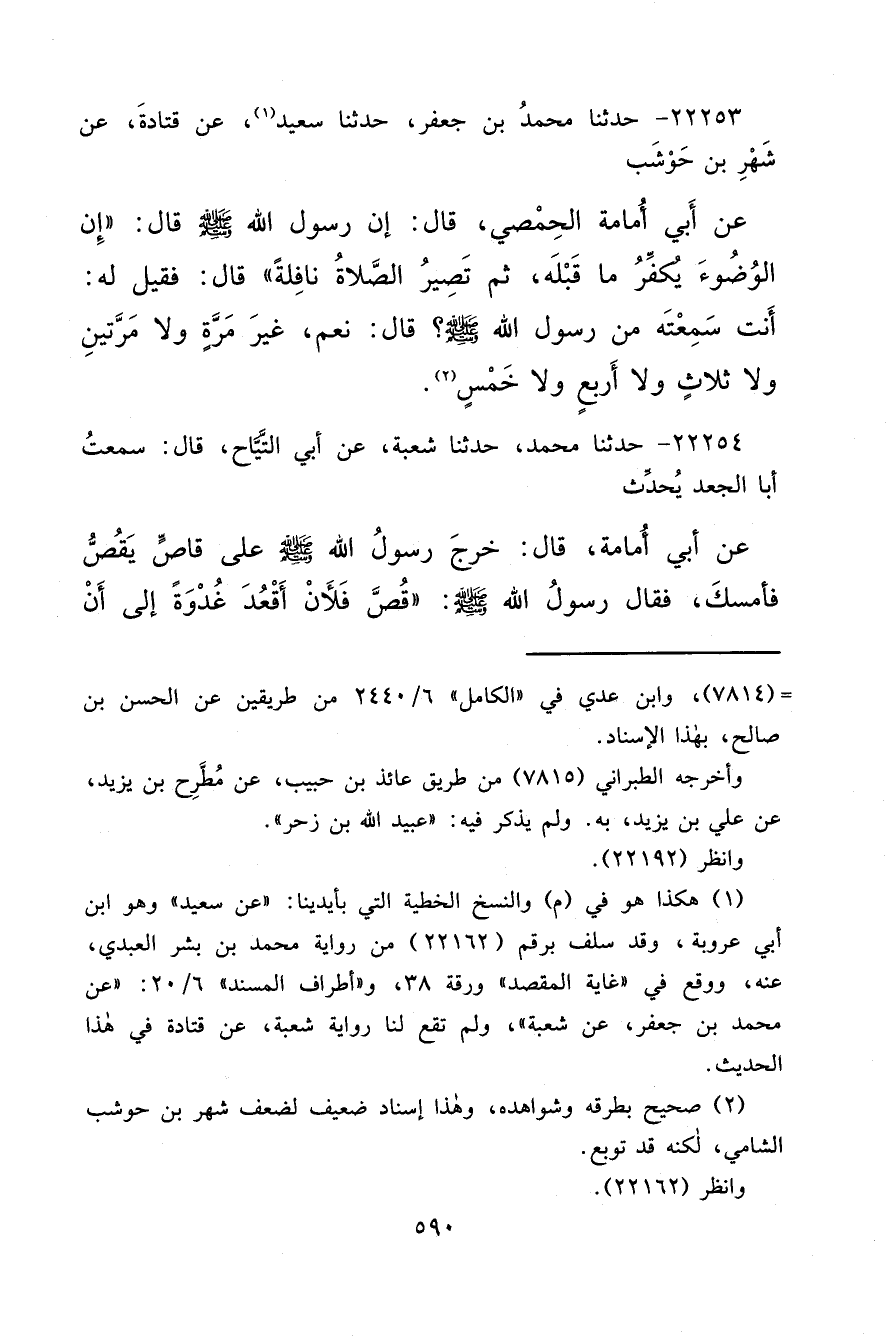٢٢٢٥٣ - حَدَّثَنَا مُحَمَّدُ بْنُ جَعْفَرٍ، حَدَّثَنَا سَعِيدٌ، (١) عَنْ قَتَادَةَ، عَنْ شَهْرِ بْنِ حَوْشَبٍ، عَنْ أَبِي أُمَامَةَ الْحِمْصِيِّ قَالَ: إِنَّ رَسُولَ اللهِ صَلَّى اللهُ عَلَيْهِ وَسَلَّمَ قَالَ: " إِنَّ الْوُضُوءَ يُكَفِّرُ مَا قَبْلَهُ، ثُمَّ تَصِيرُ الصَّلَاةُ نَافِلَةً " قَالَ: فَقِيلَ لَهُ: أَنْتَ سَمِعْتَهُ مِنْ رَسُولِ اللهِ صَلَّى اللهُ عَلَيْهِ وَسَلَّمَ؟ قَالَ: نَعَمْ. غَيْرَ مَرَّةٍ وَلَا مَرَّتَيْنِ وَلَا ثَلَاثٍ وَلَا أَرْبَعٍ وَلَا خَمْسٍ (٢)