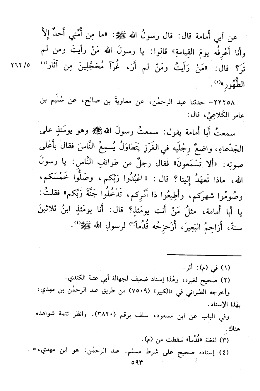 عَنْ أَبِي أُمَامَةَ قَالَ: قَالَ رَسُولُ اللهِ صَلَّى اللهُ عَلَيْهِ وَسَلَّمَ: " مَا مِنْ أُمَّتِي أَحَدٌ إِلَّا وَأَنَا أَعْرِفُهُ يَوْمَ الْقِيَامَةِ ". قَالُوا: يَا رَسُولَ اللهِ، مَنْ رَأَيْتَ وَمَنْ لَمْ تَرَ؟ " قَالَ: " مَنْ رَأَيْتُ وَمَنْ لَمْ أَرَ غُرًّا مُحَجَّلِينَ مِنْ آثَار (١) الطُّهُورِ " (٢)