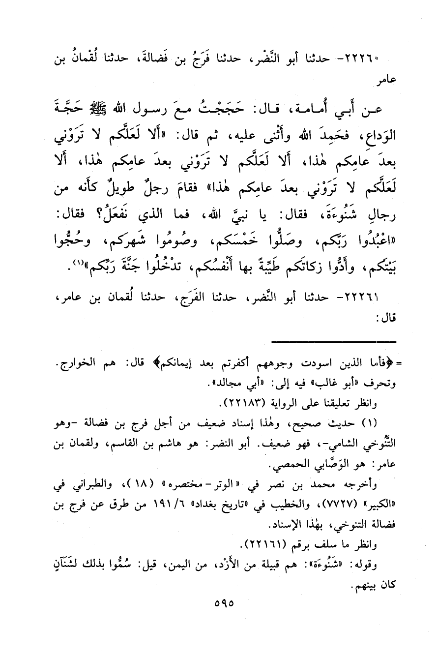 ٢٢٢٦٠ - حَدَّثَنَا أَبُو النَّضْرِ، حَدَّثَنَا فَرَجُ بْنُ فَضَالَةَ، حَدَّثَنَا لُقْمَانُ بْنُ عَامِرٍ، عَنْ أَبِي أُمَامَةَ قَالَ: حَجَجْتُ مَعَ رَسُولِ اللهِ صَلَّى اللهُ عَلَيْهِ وَسَلَّمَ حَجَّةَ الْوَدَاعِ، فَحَمِدَ اللهَ وَأَثْنَى عَلَيْهِ، ثُمَّ قَالَ: " أَلَا لَعَلَّكُمْ لَا تَرَوْنِي بَعْدَ عَامِكُمْ هَذَا، أَلَا لَعَلَّكُمْ لَا تَرَوْنِي بَعْدَ عَامِكُمْ هَذَا، أَلَا لَعَلَّكُمْ لَا تَرَوْنِي بَعْدَ عَامِكُمْ هَذَا ". فَقَامَ رَجُلٌ طَوِيلٌ كَأَنَّهُ مِنْ رِجَالِ شَنُوءَةَ فَقَالَ: يَا نَبِيَّ اللهِ، فَمَا الَّذِي نَفْعَلُ؟ فَقَالَ: " اعْبُدُوا رَبَّكُمْ وَصَلُّوا خَمْسَكُمْ، وَصُومُوا شَهْرَكُمْ، وَحُجُّوا بَيْتَكُمْ، وَأَدُّوا زَكَاتَكُمْ طَيِّبَةً بِهَا أَنْفُسُكُمْ تَدْخُلُوا جَنَّةَ رَبِّكُمْ " (١)