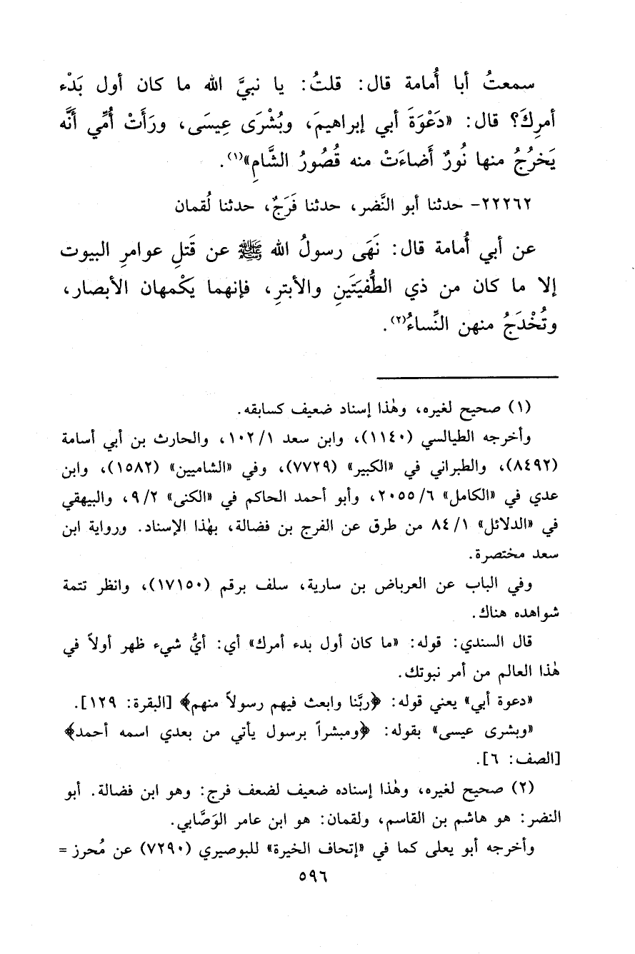 سَمِعْتُ أَبَا أُمَامَةَ قَالَ: قُلْتُ: يَا نَبِيَّ اللهِ، مَا كَانَ أَوَّلُ بَدْءِ أَمْرِكَ؟ قَالَ: " دَعْوَةُ أَبِي إِبْرَاهِيمَ وَبُشْرَى عِيسَى، وَرَأَتْ أُمِّي أَنَّهُ يَخْرُجُ مِنْهَا نُورٌ أَضَاءَتْ مِنْهُ قُصُورُ الشَّامِ " (١)