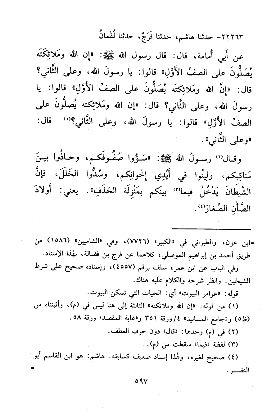 ٢٢٢٦٣ - حَدَّثَنَا هَاشِمٌ، حَدَّثَنَا فَرَجٌ، حَدَّثَنَا لُقْمَانُ، عَنْ أَبِي أُمَامَةَ قَالَ: قَالَ رَسُولُ اللهِ صَلَّى اللهُ عَلَيْهِ وَسَلَّمَ: " إِنَّ اللهَ وَمَلَائِكَتَهُ يُصَلُّونَ عَلَى الصَّفِّ الْأَوَّلِ ". قَالُوا: يَا رَسُولَ اللهِ، وَعَلَى الثَّانِي؟ قَالَ: " إِنَّ اللهَ وَمَلَائِكَتَهُ يُصَلُّونَ عَلَى الصَّفِّ الْأَوَّلِ ". قَالُوا: يَا رَسُولَ اللهِ، وَعَلَى الثَّانِي؟ (١) قَالَ: " إِنَّ اللهَ وَمَلَائِكَتِهِ يُصَلُّونَ عَلَى الصَّفِّ الْأَوَّلِ " قَالُوا يَا رَسُولَ اللهِ، وَعَلَى الثَّانِي؟ قَالَ: " وَعَلَى الثَّانِي ". وَقَالَ (٢) رَسُولُ اللهِ صَلَّى اللهُ عَلَيْهِ وَسَلَّمَ: " سَوُّوا صُفُوفَكُمْ، وَحَاذُوا بَيْنَ مَنَاكِبِكُمْ، وَلِينُوا فِي أَيْدِي إِخْوَانِكُمْ، وَسُدُّوا الْخَلَلَ؛ فَإِنَّ الشَّيْطَانَ يَدْخُلُ فِيمَا (٣) بَيْنَكُمْ بِمَنْزِلَةِ الْحَذَفِ " يَعْنِي: أَوْلَادَ الضَّأْنِ الصِّغَارَ (٤)