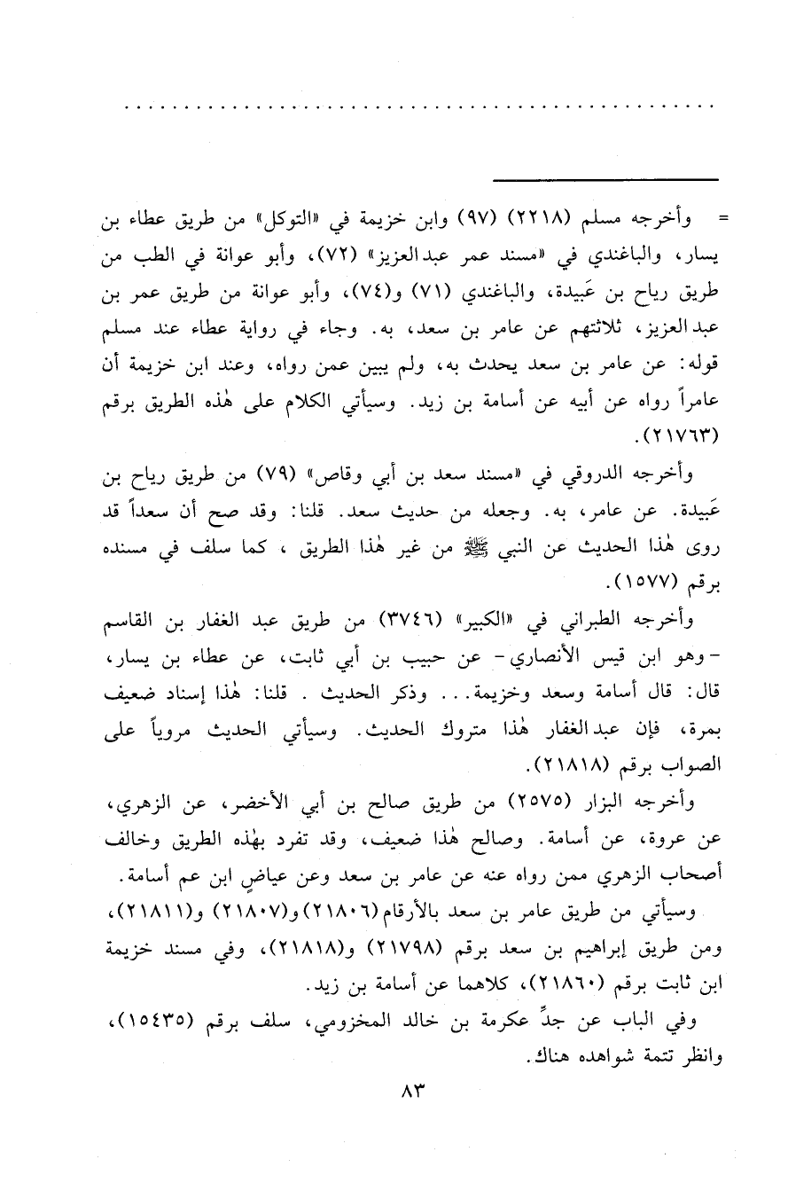 وأخرجه البزار (٢٥٧٥) من طريق صالح بن أبي الأخضر، عن الزهري، عن عروة، عن أسامة. وصالح هذا ضعيف، وقد تفرد بهذه الطريق وخالف أصحاب الزهري ممن رواه عنه عن عامر بن سعد وعن عياضٍ ابن عم أسامة.