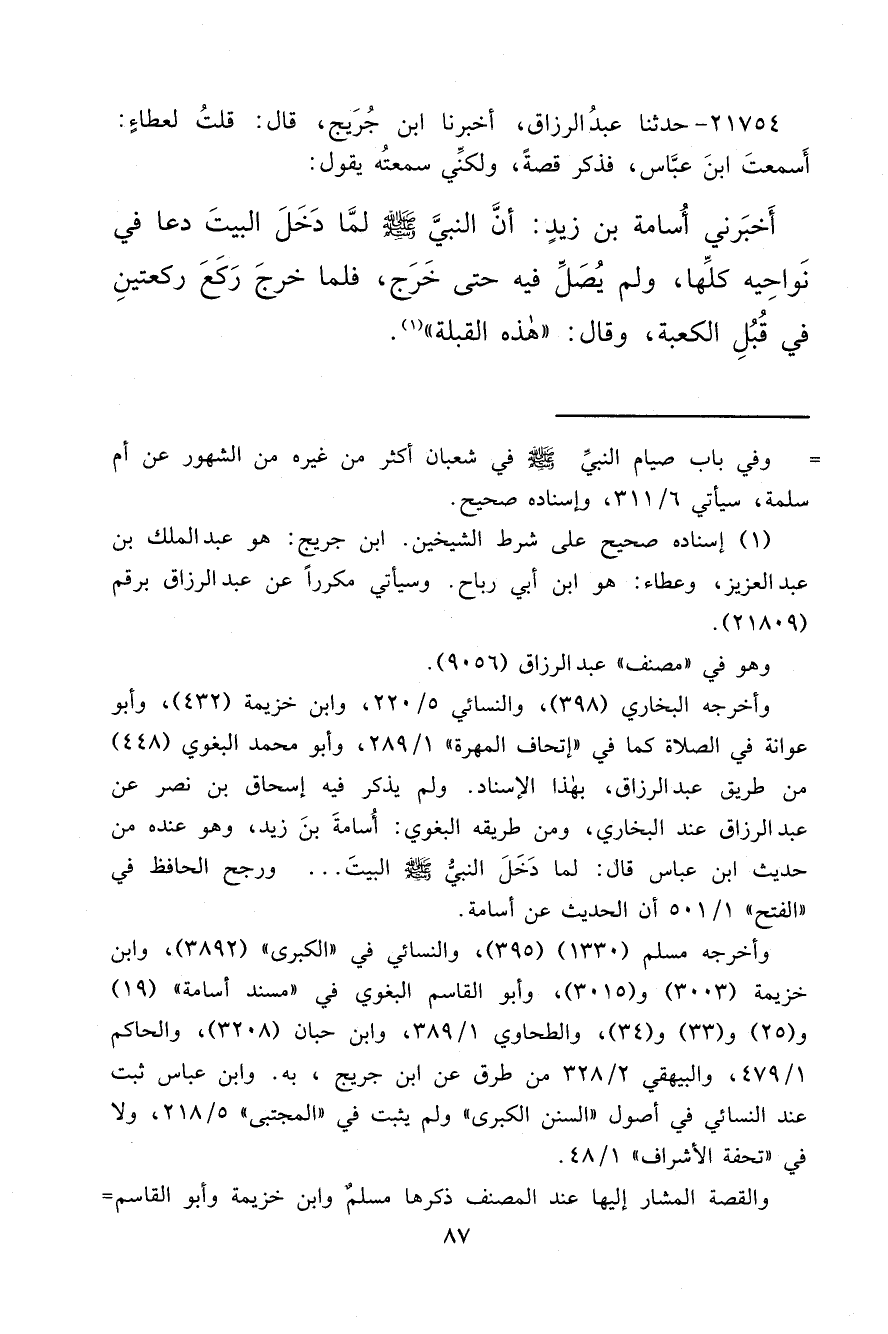 ٢١٧٥٤ - حَدَّثَنَا عَبْدُ الرَّزَّاقِ، أَخْبَرَنَا ابْنُ جُرَيْجٍ، قَالَ: قُلْتُ لِعَطَاءٍ: أَسَمِعْتَ ابْنَ عَبَّاسٍ، فَذَكَرَ قِصَّةً، وَلَكِنِّي سَمِعْتُهُ يَقُولُ: أَخْبَرَنِي أُسَامَةُ بْنُ زَيْدٍ: أَنَّ النَّبِيَّ صَلَّى اللهُ عَلَيْهِ وَسَلَّمَ لَمَّا دَخَلَ الْبَيْتَ دَعَا فِي نَوَاحِيهِ كُلِّهَا، وَلَمْ يُصَلِّ فِيهِ حَتَّى خَرَجَ، فَلَمَّا خَرَجَ رَكَعَ رَكْعَتَيْنِ فِي قِبَلِ الْكَعْبَةِ وَقَالَ: " هَذِهِ الْقِبْلَةُ " (١)