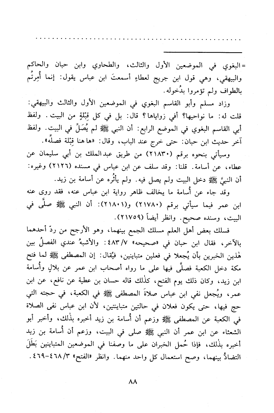 حج فيها، حتى يكون فعلان في حالتين متباينتين، لأن ابن عباس نفى الصلاة في الكعبة عن المصطفى صَلَّى اللَّه عَلَيْهِ وَسَلَّمَ وزعم أن أُسامة بن زيد أخبره بذلك، وأخبر أبو الشعثاء عن ابن عمر أن النبي صَلَّى اللَّه عَلَيْهِ وَسَلَّمَ صلى في البيت، وزعم أن أُسامة بن زيد أخبره بذلك، فإذا حُمل الخبران على ما وصفنا في الموضعين المتباينين بَطَلَ التضادُّ بينهما، وصح استعمال كل واحد منهما. وانظر "الفتح" ٣/٤٦٨-٤٦٩.
