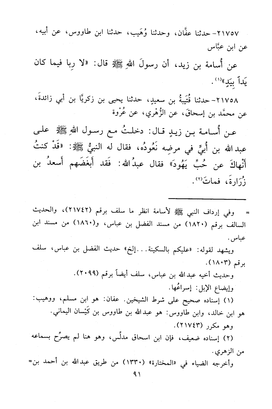 ٢١٧٥٧ - حَدَّثَنَا عَفَّانُ، وَحَدَّثَنَا وُهَيْبٌ، حَدَّثَنَا ابْنُ طَاوُسٍ، عَنْ أَبِيهِ، عَنْ ابْنِ عَبَّاسٍ، عَنْ أُسَامَةَ بْنِ زَيْدٍ، أَنَّ رَسُولَ اللهِ صَلَّى اللهُ عَلَيْهِ وَسَلَّمَ قَالَ: " لَا رِبَا فِيمَا كَانَ يَدًا بِيَدٍ " (١)