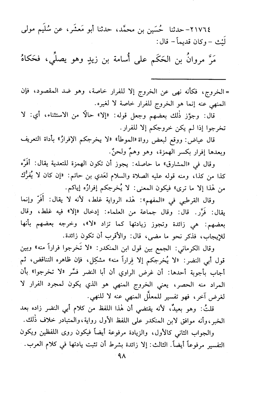 ٢١٧٦٤ - حَدَّثَنَا حُسَيْنُ بْنُ مُحَمَّدٍ، حَدَّثَنَا أَبُو مَعْشَرٍ، عَنْ سُلَيْمٍ، مَوْلًى لَيْثٍ، وَكَانَ قَدِيمًا، قَالَ: مَرَّ مَرْوَانُ بْنُ الْحَكَمِ عَلَى أُسَامَةَ بْنِ زَيْدٍ وَهُوَ يُصَلِّي، فَحَكَاهُ