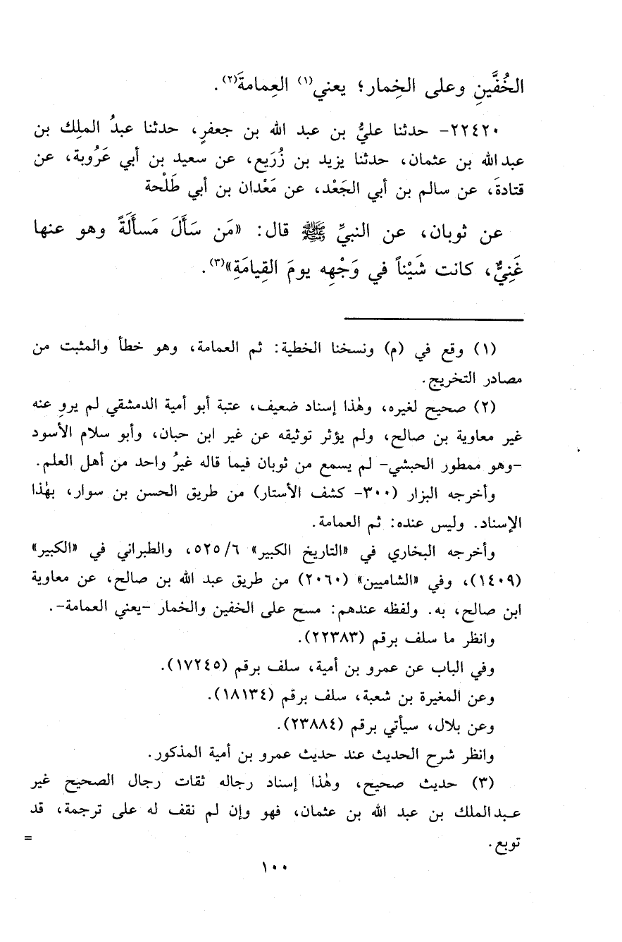 ٢٢٤٢٠ - حَدَّثَنَا عَلِيُّ بْنُ عَبْدِ اللهِ بْنِ جَعْفَرٍ، حَدَّثَنَا عَبْدُ الْمَلِكِ بْنُ عَبْدِ اللهِ بْنِ عُثْمَانَ، حَدَّثَنَا يَزِيدُ بْنُ زُرَيْعٍ، عَنْ سَعِيدِ بْنِ أَبِي عَرُوبَةَ، عَنْ قَتَادَةَ، عَنْ سَالِمِ بْنِ أَبِي الْجَعْدِ، عَنْ مَعْدَانَ بْنِ أَبِي طَلْحَةَ، عَنْ ثَوْبَانَ، عَنِ النَّبِيِّ صَلَّى اللهُ عَلَيْهِ وَسَلَّمَ قَالَ: " مَنْ سَأَلَ مَسْأَلَةً وَهُوَ عَنْهَا غَنِيٌّ كَانَتْ شَيْئًا فِي وَجْهِهِ يَوْمَ الْقِيَامَةِ " (٣)