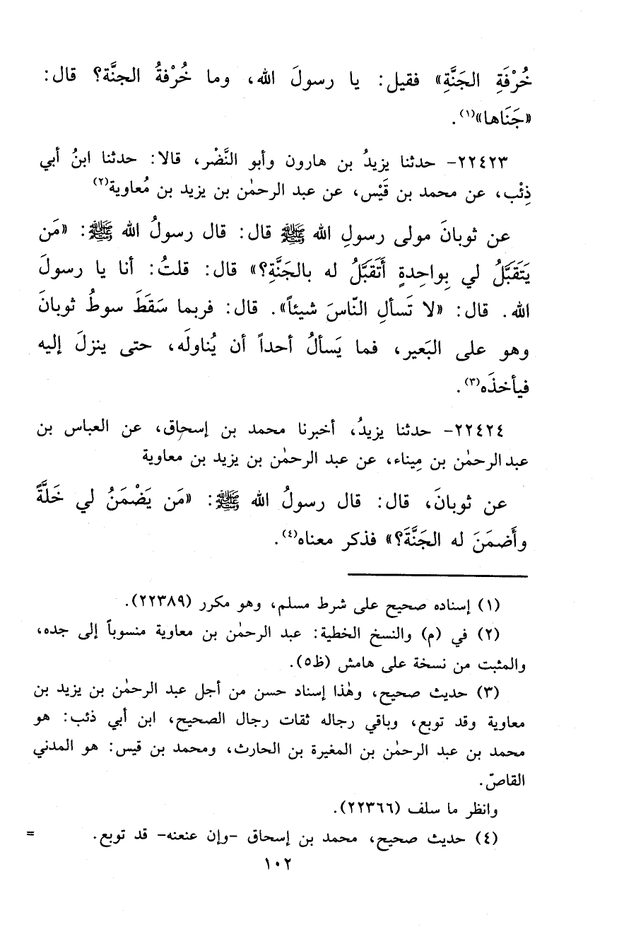 ٢٢٤٢٤ - حَدَّثَنَا يَزِيدُ، أَخْبَرَنَا مُحَمَّدُ بْنُ إِسْحَاقَ، عَنِ الْعَبَّاسِ بْنِ عَبْدِ الرَّحْمَنِ بْنِ مِينَاءَ، عَنْ عَبْدِ الرَّحْمَنِ بْنِ يَزِيدَ بْنِ مُعَاوِيَةَ، عَنْ ثَوْبَانَ قَالَ: قَالَ رَسُولُ اللهِ صَلَّى اللهُ عَلَيْهِ وَسَلَّمَ: " مَنْ يَضْمَنُ لِي خَلَّةً وَأَضْمَنُ لَهُ الْجَنَّةَ؟ "، فَذَكَرَ مَعْنَاهُ (٤)