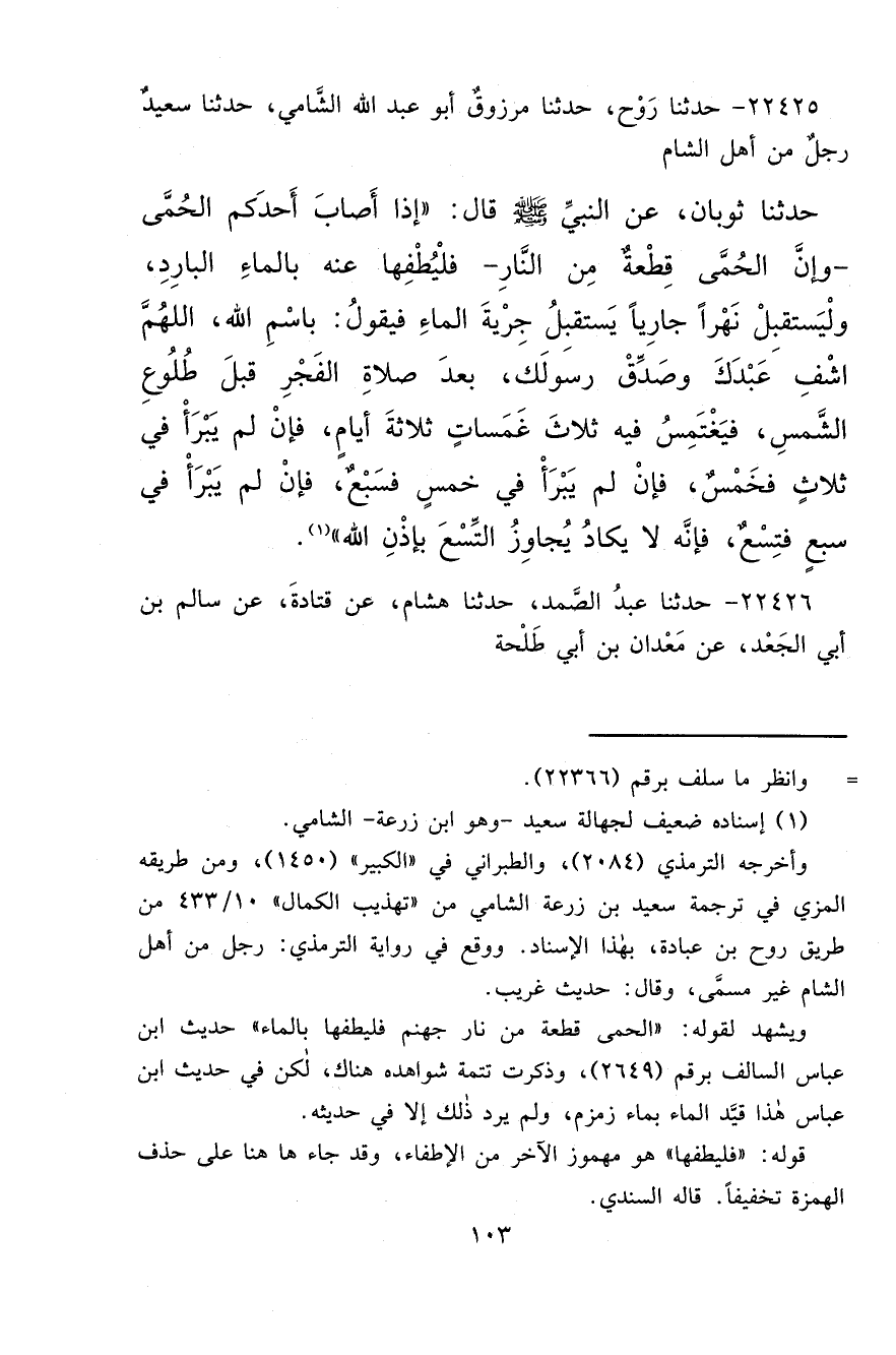 ٢٢٤٢٥ - حَدَّثَنَا رَوْحٌ، حَدَّثَنَا مَرْزُوقٌ أَبُو عَبْدِ اللهِ الشَّامِيُّ، حَدَّثَنَا سَعِيدٌ رَجُلٌ مِنْ أَهْلِ الشَّامِ، حَدَّثَنَا ثَوْبَانُ، عَنِ النَّبِيِّ صَلَّى اللهُ عَلَيْهِ وَسَلَّمَ قَالَ: " إِذَا أَصَابَ أَحَدَكُمُ الْحُمَّى، وَإِنَّ الْحُمَّى قِطْعَةٌ مِنَ النَّارِ، فَلْيُطْفِهَا عَنْهُ بِالْمَاءِ الْبَارِدِ، وَلْيَسْتَقْبِلْ نَهَرًا جَارِيًا يَسْتَقْبِلُ جِرْيَةَ الْمَاءِ فَيَقُولُ: بِاسْمِ اللهِ. اللهُمَّ اشْفِ عَبْدَكَ وَصَدِّقْ رَسُولَكَ بَعْدَ صَلَاةِ الْفَجْرِ قَبْلَ طُلُوعِ الشَّمْسِ، فَيَغْتَمِسُ فِيهِ ثَلَاثَ غَمَسَاتٍ ثَلَاثَةَ أَيَّامٍ، فَإِنْ لَمْ يَبْرَأْ فِي ثَلَاثٍ فَخَمْسٍ، فَإِنْ لَمْ يَبْرَأْ فِي خَمْسٍ فَسَبْعٍ، فَإِنْ لَمْ يَبْرَأْ فِي سَبْعٍ فَتِسْعٍ؛ فَإِنَّهُ لَا يَكَادُ يُجَاوِزُ التِّسْعَ بِإِذْنِ اللهِ " (١)