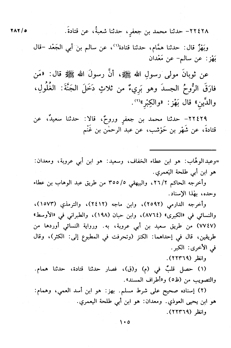 ٢٢٤٢٨ - حَدَّثَنَا مُحَمَّدُ بْنُ جَعْفَرٍ، حَدَّثَنَا شُعْبَةُ، عَنْ قَتَادَةَ، وَبَهْزٌ قَالَ:، حَدَّثَنَا هَمَّامٌ حَدَّثَنَا قَتَادَةُ (١) ، عَنْ سَالِمِ بْنِ أَبِي الْجَعْدِ قَالَ: بَهْزٌ، عَنْ سَالِمٍ، عَنْ مَعْدَانَ، عَنْ ثَوْبَانَ مَوْلَى رَسُولِ اللهِ صَلَّى اللهُ عَلَيْهِ وَسَلَّمَ، أَنَّ رَسُولَ اللهِ صَلَّى اللهُ عَلَيْهِ وَسَلَّمَ قَالَ: " مَنْ فَارَقَ الرُّوحُ الْجَسَدَ، وَهُوَ بَرِيءٌ مِنْ ثَلَاثٍ دَخَلَ الْجَنَّةَ: الْغُلُولِ وَالدَّيْنِ، قَالَ بَهْزٌ، وَالْكِبْرِ " (٢)