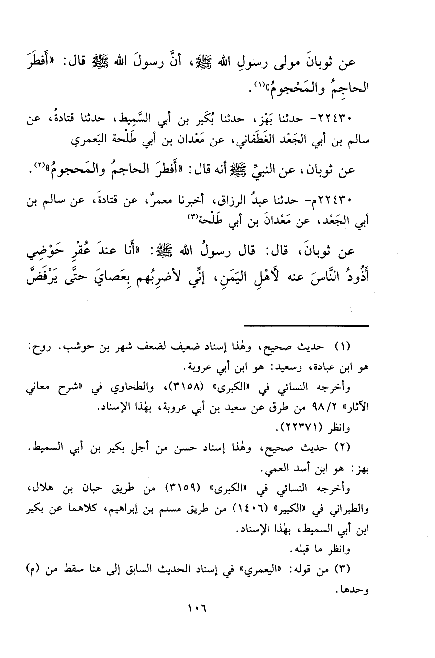 ٢٢٤٣٠ - حَدَّثَنَا بَهْزٌ، حَدَّثَنَا بُكَيْرُ بْنُ أَبِي السُّمَيْطِ، حَدَّثَنَا قَتَادَةُ، عَنْ سَالِمِ بْنِ أَبِي الْجَعْدِ الْغَطَفَانِيِّ، عَنْ مَعْدَانَ بْنِ أَبِي طَلْحَةَ اليعمري، عَنْ ثَوْبَانَ، عن النبي صَلَّى اللهُ عَلَيْهِ وَسَلَّمَ أنه قال: " أَفْطَرَ الْحَاجِمُ وَالْمَحْجُومُ". (٢)
