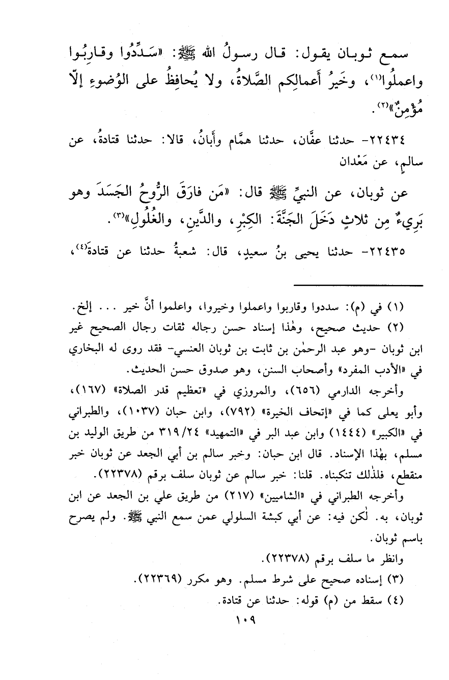 ٢٢٤٣٤ - حَدَّثَنَا عَفَّانُ، حَدَّثَنَا هَمَّامٌ، وَأَبَانُ قَالَا: حَدَّثَنَا قَتَادَةُ، عَنْ سَالِمٍ، عَنْ مَعْدَانَ، عَنْ ثَوْبَانَ، عَنِ النَّبِيِّ صَلَّى اللهُ عَلَيْهِ وَسَلَّمَ قَالَ: " مَنْ فَارَقَ الرُّوحُ الْجَسَدَ وَهُوَ بَرِيءٌ مِنْ ثَلَاثٍ دَخَلَ الْجَنَّةَ: الْكِبْرِ وَالدَّيْنِ وَالْغُلُولِ " (٣)