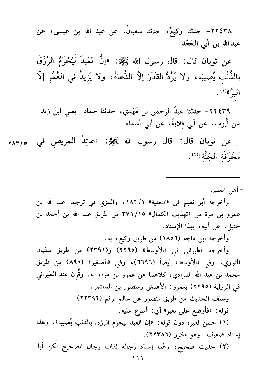 ٢٢٤٣٨ - حَدَّثَنَا وَكِيعٌ، حَدَّثَنَا سُفْيَانُ، عَنْ عَبْدِ اللهِ بْنِ عِيسَى، عَنْ عَبْدِ اللهِ بْنِ أَبِي الْجَعْدِ، عَنْ ثَوْبَانَ قَالَ: قَالَ رَسُولُ اللهِ صَلَّى اللهُ عَلَيْهِ وَسَلَّمَ: " إِنَّ الْعَبْدَ لَيُحْرَمُ الرِّزْقَ بِالذَّنْبِ يُصِيبُهُ، وَلَا يَرُدُّ الْقَدَرَ إِلَّا الدُّعَاءُ، وَلَا يَزِيدُ فِي الْعُمُرِ إِلَّا الْبِرُّ " (١)
