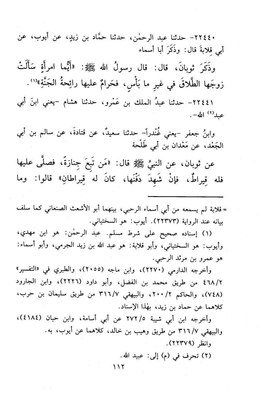 ٢٢٤٤٠ - حَدَّثَنَا عَبْدُ الرَّحْمَنِ، حَدَّثَنَا حَمَّادُ بْنُ زَيْدٍ، عَنْ أَيُّوبَ، عَنْ أَبِي قِلَابَةَ قَالَ: وَذَكَرَ أَبَا أَسْمَاءَ، وَذَكَرَ ثَوْبَانَ قَالَ: قَالَ رَسُولُ اللهِ صَلَّى اللهُ عَلَيْهِ وَسَلَّمَ: " أَيُّمَا امْرَأَةٍ سَأَلَتْ زَوْجَهَا الطَّلَاقَ فِي غَيْرِ مَا بَأْسٍ فَحَرَامٌ عَلَيْهَا رَائِحَةُ الْجَنَّةِ " (١)