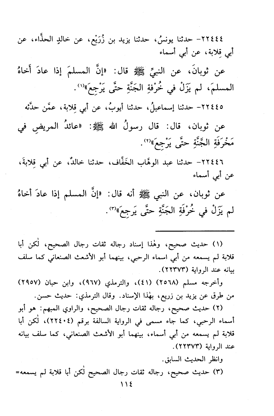 ٢٢٤٤٦ - حَدَّثَنَا عَبْدُ الْوَهَّابِ الْخَفَّافُ، حَدَّثَنَا خَالِدٌ، عَنْ أَبِي قِلَابَةَ، عَنْ أَبِي أَسْمَاءَ، عَنْ ثَوْبَانَ، عَنِ النَّبِيِّ صَلَّى اللهُ عَلَيْهِ وَسَلَّمَ أَنَّهُ قَالَ: " إِنَّ الْمُسْلِمَ إِذَا عَادَ أَخَاهُ لَمْ يَزَلْ فِي خُرْفَةِ الْجَنَّةِ حَتَّى يَرْجِعَ " (٣)
