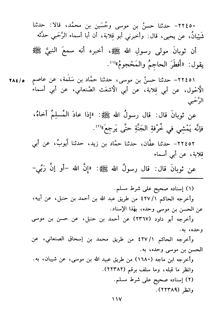 ٢٢٤٥٠ - حَدَّثَنَا حَسَنُ بْنُ مُوسَى، وَحُسَيْنُ بْنُ مُحَمَّدٍ قَالَا: حَدَّثَنَا شَيْبَانُ، عَنْ يَحْيَى قَالَ: وَأَخْبَرَنِي أَبُو قِلَابَةَ، أَنَّ أَبَا أَسْمَاءَ الرَّحَبِيَّ حَدَّثَهُ، أَنَّ ثَوْبَانَ مَوْلَى رَسُولِ اللهِ صَلَّى اللهُ عَلَيْهِ وَسَلَّمَ أَخْبَرَهُ، أَنَّهُ سَمِعَ النَّبِيَّ صَلَّى اللهُ عَلَيْهِ وَسَلَّمَ يَقُولُ: " أَفْطَرَ الْحَاجِمُ وَالْمَحْجُومُ " (١)