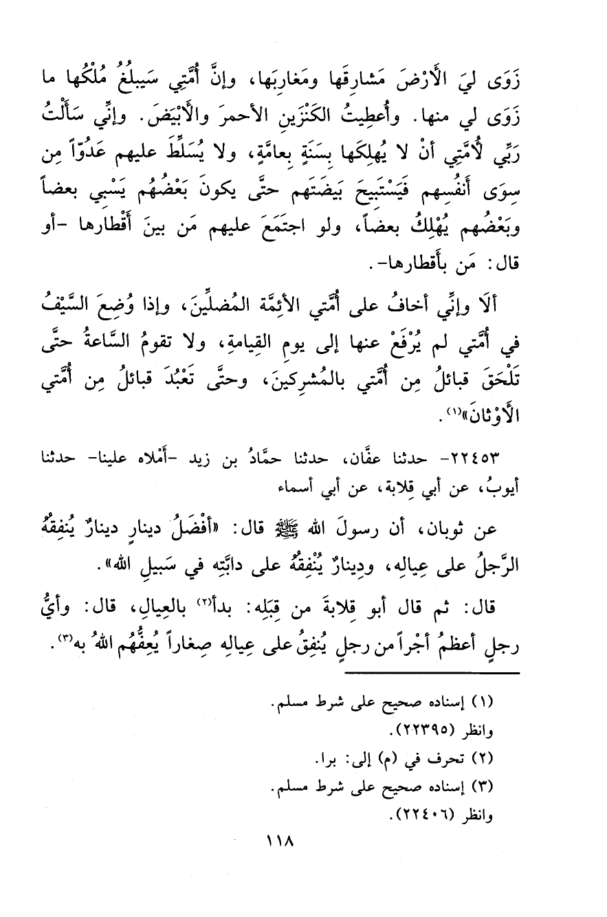 ٢٢٤٥٣ - حَدَّثَنَا عَفَّانُ، حَدَّثَنَا حَمَّادُ بْنُ زَيْدٍ أَمْلَاهُ عَلَيْنَا، حَدَّثَنَا أَيُّوبُ، عَنْ أَبِي قِلَابَةَ، عَنْ أَبِي أَسْمَاءَ، عَنْ ثَوْبَانَ، أَنَّ رَسُولَ اللهِ صَلَّى اللهُ عَلَيْهِ وَسَلَّمَ قَالَ: " أَفْضَلُ دِينَارٍ دِينَارٌ يُنْفِقُهُ الرَّجُلُ عَلَى عِيَالِهِ، وَدِينَارٌ يُنْفِقُهُ عَلَى دَابَّتِهِ فِي سَبِيلِ اللهِ " قَالَ ثُمَّ قَالَ أَبُو قِلَابَةَ مِنْ قِبَلِهِ: بَدَأَ (٢) بِالْعِيَالِ قَالَ: وَأَيُّ رَجُلٍ أَعْظَمُ أَجْرًا مِنْ رَجُلٍ يُنْفِقُ عَلَى عِيَالِهِ صِغَارًا يُعِفُّهُمُ اللهُ بِهِ (٣)