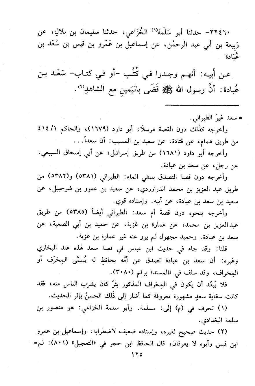٢٢٤٦٠ - حَدَّثَنَا أَبُو سَلَمَةَ (١) الْخُزَاعِيُّ، حَدَّثَنَا سُلَيْمَانُ بْنُ بِلَالٍ، عَنْ رَبِيعَةَ بْنِ أَبِي عَبْدِ الرَّحْمَنِ، عَنْ إِسْمَاعِيلَ بْنِ عَمْرِو بْنِ قَيْسِ بْنِ سَعْدِ بْنِ عُبَادَةَ، عَنْ أَبِيهِ، أَنَّهُمْ وَجَدُوا فِي كُتُبِ أَوْ فِي كِتَابِ سَعْدِ بْنِ عُبَادَةَ، أَنَّ رَسُولَ اللهِ صَلَّى اللهُ عَلَيْهِ وَسَلَّمَ: " قَضَى بِالْيَمِينِ مَعَ الشَّاهِدِ " (٢)