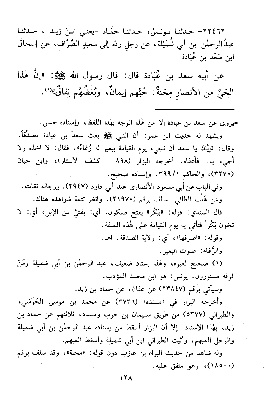 ٢٢٤٦٢ - حَدَّثَنَا يُونُسُ، حَدَّثَنَا حَمَّادٌ يَعْنِي ابْنَ زَيْدٍ، حَدَّثَنَا عَبْدُ الرَّحْمَنِ بْنُ أَبِي شُمَيْلَةَ، عَنْ رَجُلٍ رَدَّهُ إِلَى سَعِيدٍ الصَّرَّافِ، عَنْ إِسْحَاقَ بْنِ سَعْدِ بْنِ عُبَادَةَ، عَنْ أَبِيهِ سَعْدِ بْنِ عُبَادَةَ قَالَ: قَالَ رَسُولُ اللهِ صَلَّى اللهُ عَلَيْهِ وَسَلَّمَ: " إِنَّ هَذَا الْحَيَّ مِنَ الْأَنْصَارِ مِحْنَةٌ حُبُّهُمْ إِيمَانٌ، وَبُغْضُهُمْ نِفَاقٌ " (١)