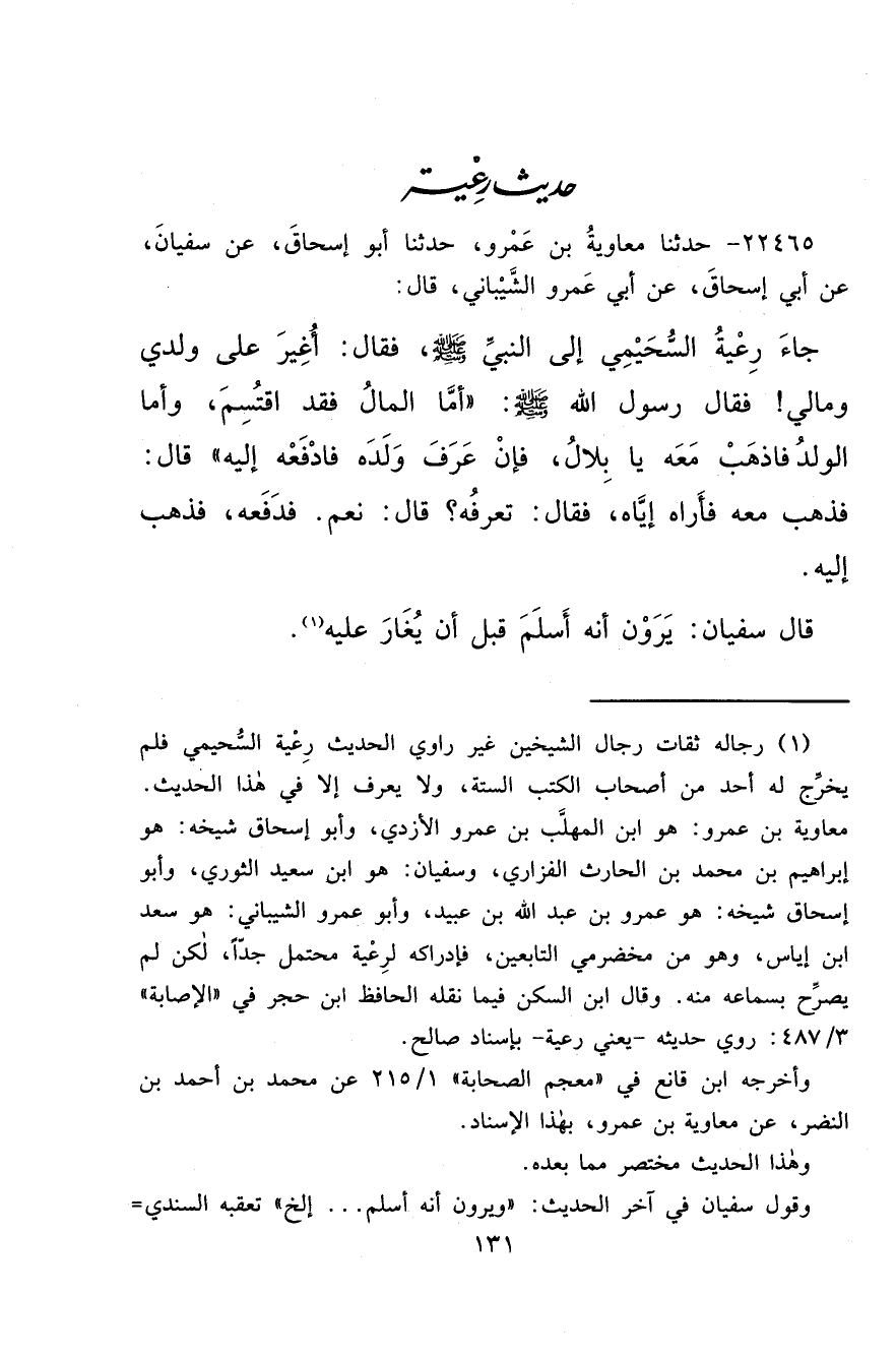 ٢٢٤٦٥ - حَدَّثَنَا مُعَاوِيَةُ بْنُ عَمْرٍو، حَدَّثَنَا أَبُو إِسْحَاقَ، عَنْ سُفْيَانَ، عَنْ أَبِي إِسْحَاقَ، عَنْ أَبِي عَمْرٍو الشَّيْبَانِيِّ قَالَ: جَاءَ رِعْيَةُ السُّحَيْمِيُّ إِلَى النَّبِيِّ صَلَّى اللهُ عَلَيْهِ وَسَلَّمَ فَقَالَ: أُغِيرَ عَلَى وَلَدِي وَمَالِي، فَقَالَ رَسُولُ اللهِ صَلَّى اللهُ عَلَيْهِ وَسَلَّمَ: " أَمَّا الْمَالُ فَقَدِ اقْتُسِمَ، وَأَمَّا الْوَلَدُ فَاذْهَبْ مَعَهُ يَا بِلَالُ فَإِنْ عَرَفَ وَلَدَهُ فَادْفَعْهُ إِلَيْهِ " قَالَ: فَذَهَبَ مَعَهُ فَأَرَاهُ إِيَّاهُ فَقَالَ: تَعْرِفُهُ؟ قَالَ: نَعَمْ. فَدَفَعَهُ فَذَهَبَ إِلَيْهِ. قَالَ سُفْيَانُ: يَرَوْنَ أَنَّهُ أَسْلَمَ قَبْلَ أَنْ يُغَارَ عَلَيْهِ (١)