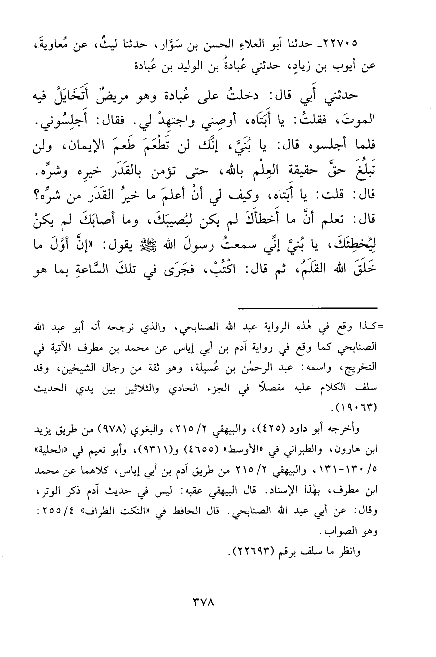 ٢٢٧٠٥ - حَدَّثَنَا أَبُو الْعَلَاءِ الْحَسَنُ بْنُ سَوَّارٍ، حَدَّثَنَا لَيْثٌ، عَنْ مُعَاوِيَةَ، عَنْ أَيُّوبَ بْنِ زِيَادٍ، حَدَّثَنِي عُبَادَةُ بْنُ الْوَلِيدِ بْنِ عُبَادَةَ، حَدَّثَنِي أَبِي قَالَ: دَخَلْتُ عَلَى عُبَادَةَ، وَهُوَ مَرِيضٌ أَتَخَايَلُ فِيهِ الْمَوْتَ فَقُلْتُ: يَا أَبَتَاهُ أَوْصِنِي وَاجْتَهِدْ لِي. فَقَالَ: أَجْلِسُونِي. فَلَمَّا أَجْلَسُوهُ قَالَ: يَا بُنَيَّ إِنَّكَ لَنْ تَطْعَمَ طَعْمَ الْإِيمَانِ، وَلَنْ تَبْلُغْ حَقَّ حَقِيقَةِ الْعِلْمِ بِاللهِ حَتَّى تُؤْمِنَ بِالْقَدَرِ خَيْرِهِ وَشَرِّهِ قَالَ: قُلْتُ: يَا أَبَتَاهُ وَكَيْفَ لِي أَنْ أَعْلَمَ مَا خَيْرُ الْقَدَرِ مِنْ شَرِّهِ؟ قَالَ: تَعْلَمُ أَنَّ مَا أَخْطَأَكَ لَمْ يَكُنْ لِيُصِيبَكَ، وَمَا أَصَابَكَ لَمْ يَكُنْ لِيُخْطِئَكَ. يَا بُنَيَّ إِنِّي سَمِعْتُ رَسُولَ اللهِ صَلَّى اللهُ عَلَيْهِ وَسَلَّمَ يَقُولُ: " إِنَّ أَوَّلَ مَا خَلَقَ اللهُ الْقَلَمُ، ثُمَّ قَالَ: اكْتُبْ فَجَرَى فِي تِلْكَ السَّاعَةِ بِمَا هُوَ