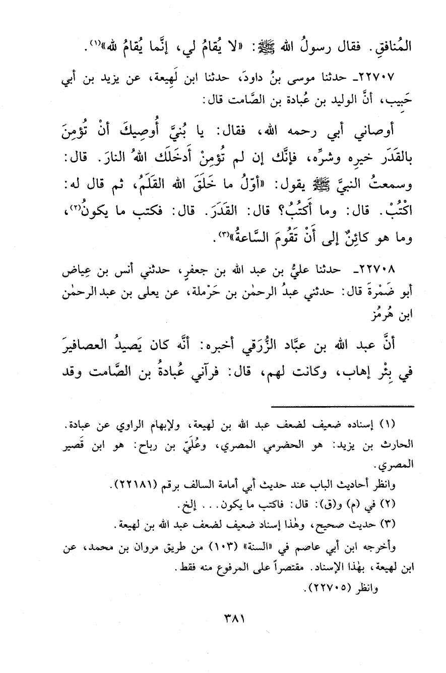 ٢٢٧٠٧ - حَدَّثَنَا مُوسَى بْنُ دَاوُدَ، حَدَّثَنَا ابْنُ لَهِيعَةَ، عَنْ يَزِيدَ بْنِ أَبِي حَبِيبٍ، أَنَّ الْوَلِيدَ بْنَ عُبَادَةَ بْنِ الصَّامِتِ قَالَ: أَوْصَانِي أَبِي رَحِمَهُ اللهُ فَقَالَ: يَا بُنَيَّ أُوصِيكَ أَنْ تُؤْمِنَ بِالْقَدَرِ خَيْرِهِ وَشَرِّهِ؛ فَإِنَّكَ إِنْ لَمْ تُؤْمِنْ أَدْخَلَكَ اللهُ النَّارَ قَالَ: وَسَمِعْتُ النَّبِيَّ صَلَّى اللهُ عَلَيْهِ وَسَلَّمَ يَقُولُ: " أَوَّلُ مَا خَلَقَ اللهُ الْقَلَمُ، ثُمَّ قَالَ لَهُ: اكْتُبْ. قَالَ: وَمَا أَكْتُبُ؟ قَالَ: الْقَدَرُ قَالَ: فَكَتَبَ مَا يَكُونُ (٢) وَمَا هُوَ كَائِنٌ إِلَى أَنْ تَقُومَ السَّاعَةُ " (٣)