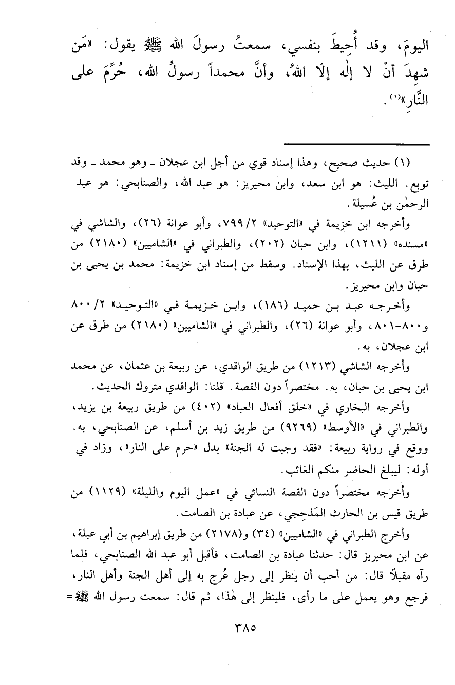 الْيَوْمَ وَقَدْ أُحِيطَ بِنَفْسِي، سَمِعْتُ رَسُولَ اللهِ صَلَّى اللهُ عَلَيْهِ وَسَلَّمَ يَقُولُ: " مَنْ شَهِدَ أَنْ لَا إِلَهَ إِلَّا اللهُ وَأَنَّ مُحَمَّدًا رَسُولُ اللهِ حُرِّمَ عَلَى النَّارِ " (١)