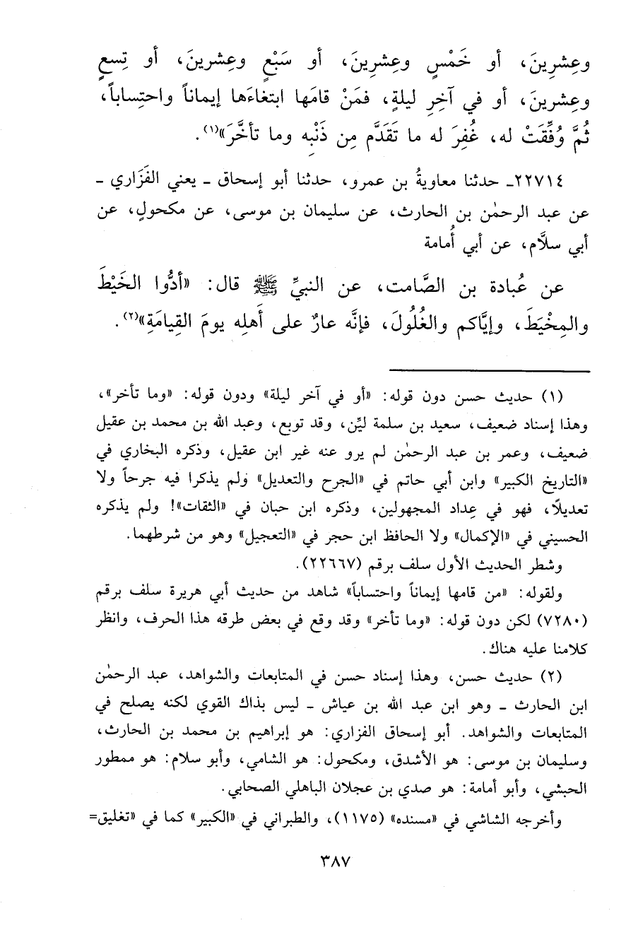 ٢٢٧١٤ - حَدَّثَنَا مُعَاوِيَةُ بْنُ عَمْرٍو، حَدَّثَنَا أَبُو إِسْحَاقَ يَعْنِي الْفَزَارِيَّ، عَنْ عَبْدِ الرَّحْمَنِ بْنِ الْحَارِثِ، عَنْ سُلَيْمَانَ بْنِ مُوسَى، عَنْ مَكْحُولٍ، عَنْ أَبِي سَلَّامٍ، عَنْ أَبِي أُمَامَةَ، عَنْ عُبَادَةَ بْنِ الصَّامِتِ، عَنِ النَّبِيِّ صَلَّى اللهُ عَلَيْهِ وَسَلَّمَ قَالَ: " أَدُّوا الْخَيْطَ وَالْمَخِيطَ، وَإِيَّاكُمْ وَالْغُلُولَ؛ فَإِنَّهُ عَارٌ عَلَى أَهْلِهِ يَوْمَ الْقِيَامَةِ " (٢)