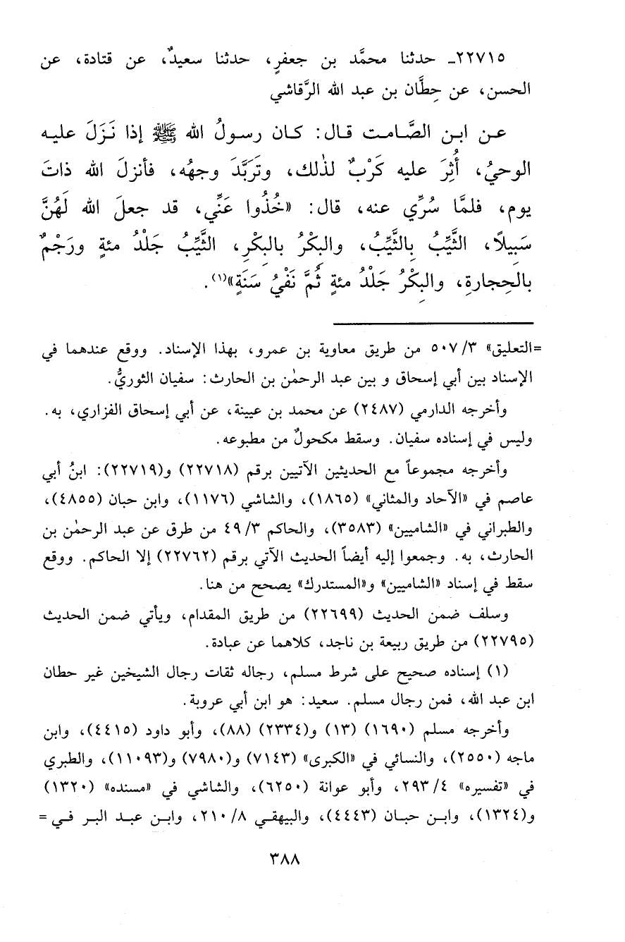٢٢٧١٥ - حَدَّثَنَا مُحَمَّدُ بْنُ جَعْفَرٍ، حَدَّثَنَا سَعِيدٌ، عَنْ قَتَادَةَ، عَنِ الْحَسَنِ، عَنْ حِطَّانَ بْنِ عَبْدِ اللهِ الرَّقَاشِيِّ، عَنِ ابْنِ الصَّامِتِ قَالَ: كَانَ رَسُولُ اللهِ صَلَّى اللهُ عَلَيْهِ وَسَلَّمَ: إِذَا نَزَلَ عَلَيْهِ الْوَحْيُ أَثَّرَ عَلَيْهِ كَرَبَ لِذَلِكَ، وَتَرَبَّدَ وَجْهُهُ، فَأَنْزَلَ اللهُ ذَاتَ يَوْمٍ، فَلَمَّا سُرِّيَ عَنْهُ قَالَ: " خُذُوا عَنِّي قَدْ جَعَلَ اللهُ لَهُنَّ سَبِيلًا الثَّيِّبُ بِالثَّيِّبِ، وَالْبِكْرُ بِالْبِكْرِ، الثَّيِّبُ جَلْدُ مِائَةٍ وَرَجْمٌ بِالْحِجَارَةِ، وَالْبِكْرُ جَلْدُ مِائَةٍ ثُمَّ نَفْيُ سَنَةٍ " (١)