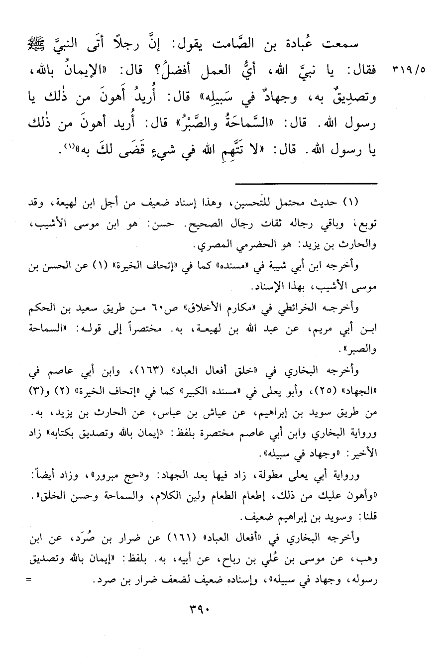سَمِعْتُ عُبَادَةَ بْنَ الصَّامِتِ يَقُولُ: إِنَّ رَجُلًا أَتَى النَّبِيَّ صَلَّى اللهُ عَلَيْهِ وَسَلَّمَ فَقَالَ: يَا نَبِيَّ اللهِ، أَيُّ الْعَمَلِ أَفْضَلُ؟ قَالَ: " الْإِيمَانُ بِاللهِ وَتَصْدِيقٌ بِهِ وَجِهَادٌ فِي سَبِيلِهِ ". قَالَ: أُرِيدُ أَهْوَنَ مِنْ ذَلِكَ يَا رَسُولَ اللهِ. قَالَ: " السَّمَاحَةُ وَالصَّبْرُ ". قَالَ: أُرِيدُ أَهْوَنَ مِنْ ذَلِكَ يَا رَسُولَ اللهِ. قَالَ: " لَا تَتَّهِمِ اللهَ فِي شَيْءٍ قَضَى لَكَ بِهِ " (١)