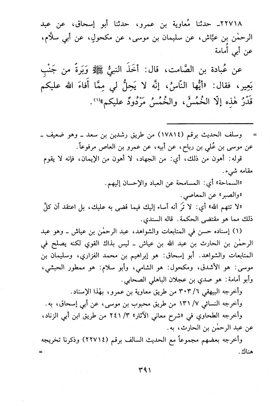 ٢٢٧١٨ - حَدَّثَنَا مُعَاوِيَةُ بْنُ عَمْرٍو، حَدَّثَنَا أَبُو إِسْحَاقَ، عَنْ عَبْدِ الرَّحْمَنِ بْنِ عَيَّاشٍ، عَنْ سُلَيْمَانَ بْنِ مُوسَى، عَنْ مَكْحُولٍ، عَنْ أَبِي سَلَّامٍ، عَنْ أَبِي أُمَامَةَ، عَنْ عُبَادَةَ بْنِ الصَّامِتِ قَالَ: أَخَذَ النَّبِيُّ صَلَّى اللهُ عَلَيْهِ وَسَلَّمَ وَبَرَةً مِنْ جَنْبِ بَعِيرٍ فَقَالَ: " أَيُّهَا النَّاسُ إِنَّهُ، لَا يَحِلُّ لِي مِمَّا أَفَاءَ اللهُ عَلَيْكُمْ قَدْرَ هَذِهِ إِلَّا الْخُمُسُ، وَالْخُمُسُ مَرْدُودٌ عَلَيْكُمْ " (١)