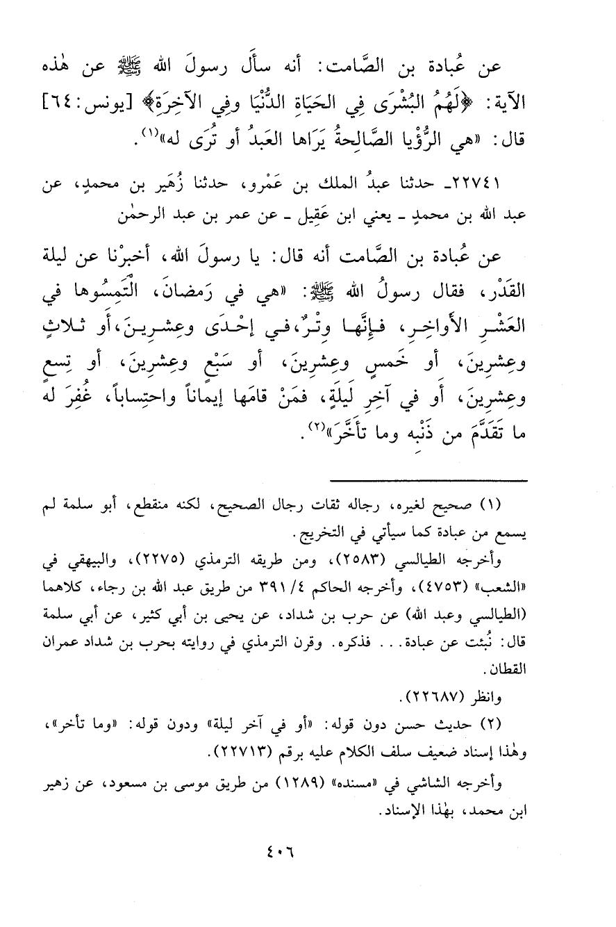 ٢٢٧٤١ - حَدَّثَنَا عَبْدُ الْمَلِكِ بْنُ عَمْرٍو، حَدَّثَنَا زُهَيْرُ بْنُ مُحَمَّدٍ، عَنْ عَبْدِ اللهِ بْنِ مُحَمَّدٍ يَعْنِي ابْنَ عَقِيلٍ، عَنْ عُمَرَ بْنِ عَبْدِ الرَّحْمَنِ، عَنْ عُبَادَةَ بْنِ الصَّامِتِ أَنَّهُ قَالَ: يَا رَسُولَ اللهِ، أَخْبِرْنَا عَنْ لَيْلَةِ الْقَدْرِ. فَقَالَ رَسُولُ اللهِ صَلَّى اللهُ عَلَيْهِ وَسَلَّمَ: " هِيَ فِي رَمَضَانَ الْتَمِسُوهَا فِي الْعَشْرِ الْأَوَاخِرِ؛ فَإِنَّهَا وِتْرٌ: فِي إِحْدَى وَعِشْرِينَ، أَوْ ثَلَاثٍ وَعِشْرِينَ، أَوْ خَمْسٍ وَعِشْرِينَ، أَوْ سَبْعٍ وَعِشْرِينَ، أَوْ تِسْعٍ وَعِشْرِينَ، أَوْ فِي آخِرِ لَيْلَةٍ، فَمَنْ قَامَهَا إِيمَانًا وَاحْتِسَابًا غُفِرَ لَهُ مَا تَقَدَّمَ مِنْ ذَنْبِهِ وَمَا تَأَخَّرَ " (٢)
