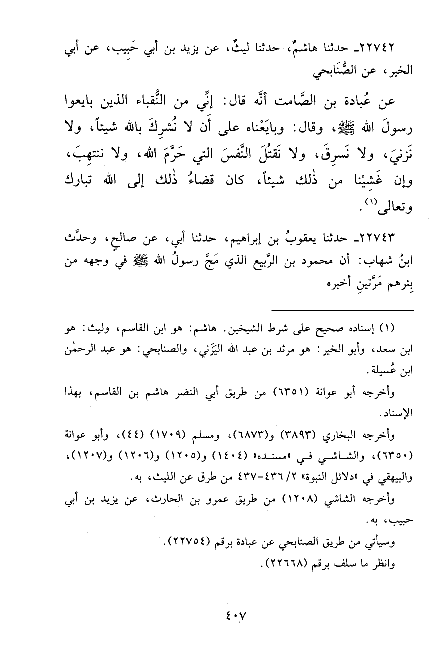 ٢٢٧٤٢ - حَدَّثَنَا هَاشِمٌ، حَدَّثَنَا لَيْثٌ، عَنْ يَزِيدَ بْنِ أَبِي حَبِيبٍ، عَنْ أَبِي الْخَيْرِ، عَنْ الصُّنَابِحِيِّ، عَنْ عُبَادَةَ بْنِ الصَّامِتِ أَنَّهُ قَالَ: إِنِّي مِنَ النُّقَبَاءِ الَّذِينَ بَايَعُوا رَسُولَ اللهِ صَلَّى اللهُ عَلَيْهِ وَسَلَّمَ وَقَالَ: " وَبَايَعْنَاهُ عَلَى أَنْ لَا نُشْرِكَ بِاللهِ شَيْئًا، وَلَا نَزْنِيَ، وَلَا نَسْرِقَ، وَلَا نَقْتُلَ النَّفْسَ الَّتِي حَرَّمَ اللهُ، وَلَا نَنْتَهِبَ، وَإِنْ غَشِينَا مِنْ ذَلِكَ شَيْئًا كَانَ قَضَاءُ ذَلِكَ إِلَى اللهِ تَبَارَكَ وَتَعَالَى " (١)