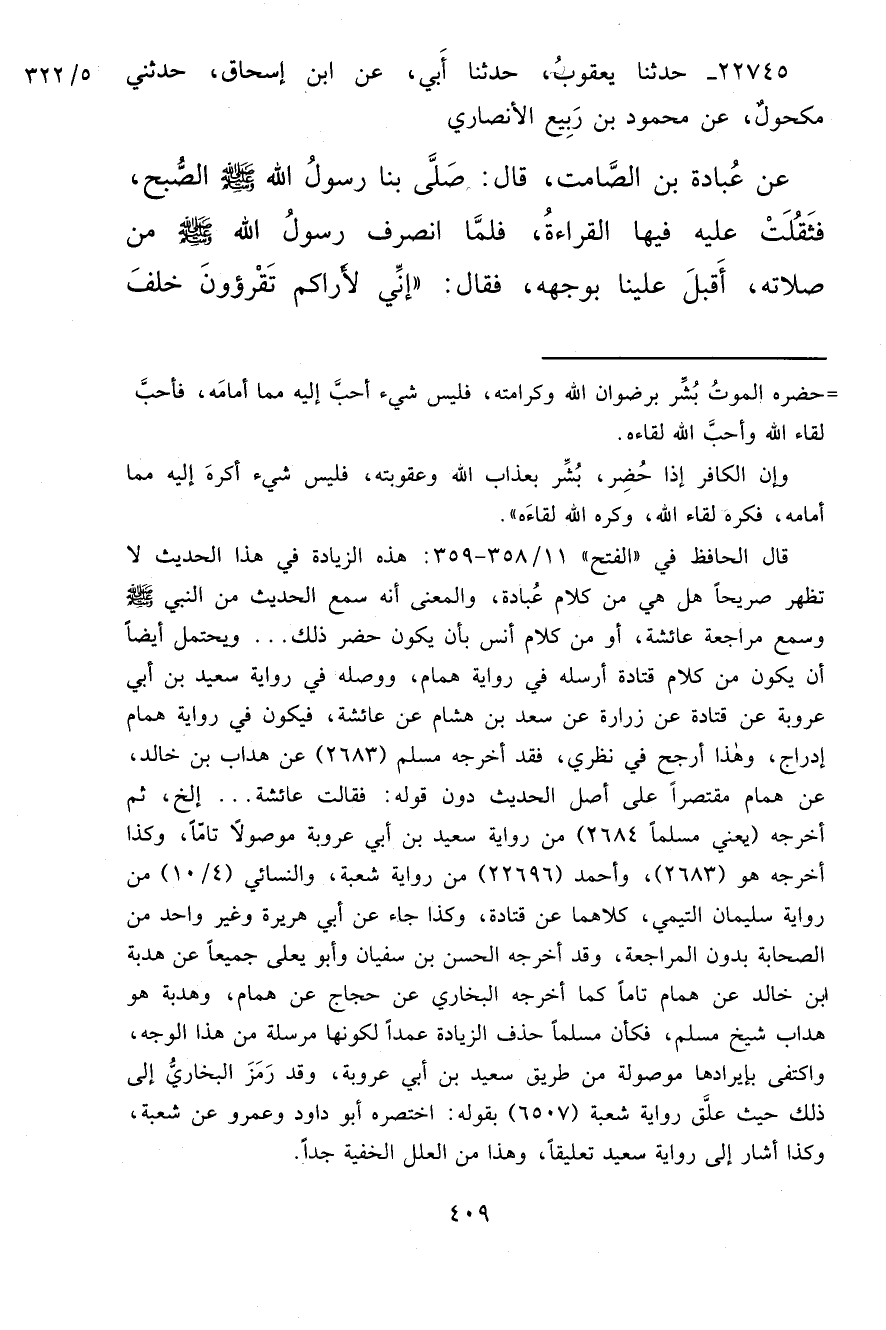 قال الحافظ في "الفتح" ١١/٣٥٨-٣٥٩: هذه الزيادة في هذا الحديث لا تظهر صريحاً هل هي من كلام عُبادة، والمعنى أنه سمع الحديث من النبي صَلَّى اللهُ عَلَيْهِ وَسَلَّمَ وسمع مراجعة عائشة، أو من كلام أنس بأن يكون حضر ذلك ... ويحتمل أيضاً أن يكون من كلام قتادة أرسله في رواية همام، ووصله في رواية سعيد بن أبي عروبة عن قتادة عن زرارة عن سعد بن هشام عن عائشة، فيكون في رواية همام إدراج، وهذا أرجح في نظري، فقد أخرجه مسلم (٢٦٨٣) عن هداب بن خالد،