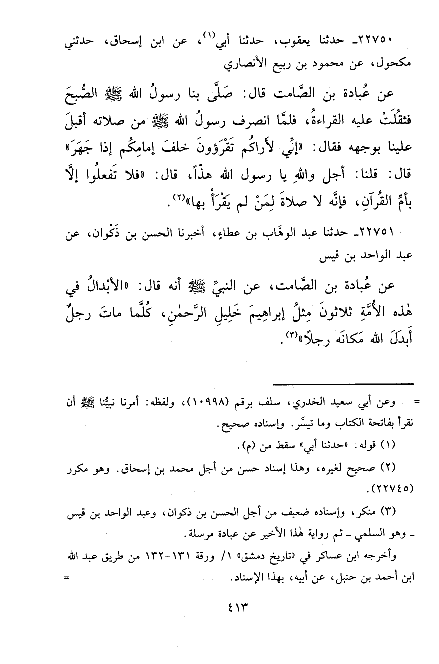 ٢٢٧٥٠ - حَدَّثَنَا يَعْقُوبُ، حَدَّثَنَا أَبِي (١) ، عَنِ ابْنِ إِسْحَاقَ، حَدَّثَنِي مَكْحُولٌ، عَنْ مَحْمُودِ بْنِ رَبِيعٍ الْأَنْصَارِيِّ، عَنْ عُبَادَةَ بْنِ الصَّامِتِ قَالَ: صَلَّى بِنَا رَسُولُ اللهِ صَلَّى اللهُ عَلَيْهِ وَسَلَّمَ الصُّبْحَ، فَثَقُلَتْ عَلَيْهِ الْقِرَاءَةُ، فَلَمَّا انْصَرَفَ رَسُولُ اللهِ صَلَّى اللهُ عَلَيْهِ وَسَلَّمَ مِنْ صَلَاتِهِ أَقْبَلَ عَلَيْنَا بِوَجْهِهِ فَقَالَ: " إِنِّي لَأَرَاكُمْ تَقْرَءُونَ خَلْفَ إِمَامِكُمْ إِذَا جَهَرَ ". قَالَ: قُلْنَا أَجَلْ. وَاللهِ يَا رَسُولَ اللهِ هَذَا. قَالَ: " فَلَا تَفْعَلُوا إِلَّا بِأُمِّ الْقُرْآنِ؛ فَإِنَّهُ لَا صَلَاةَ لِمَنْ لَمْ يَقْرَأْ بِهَا " (٢)