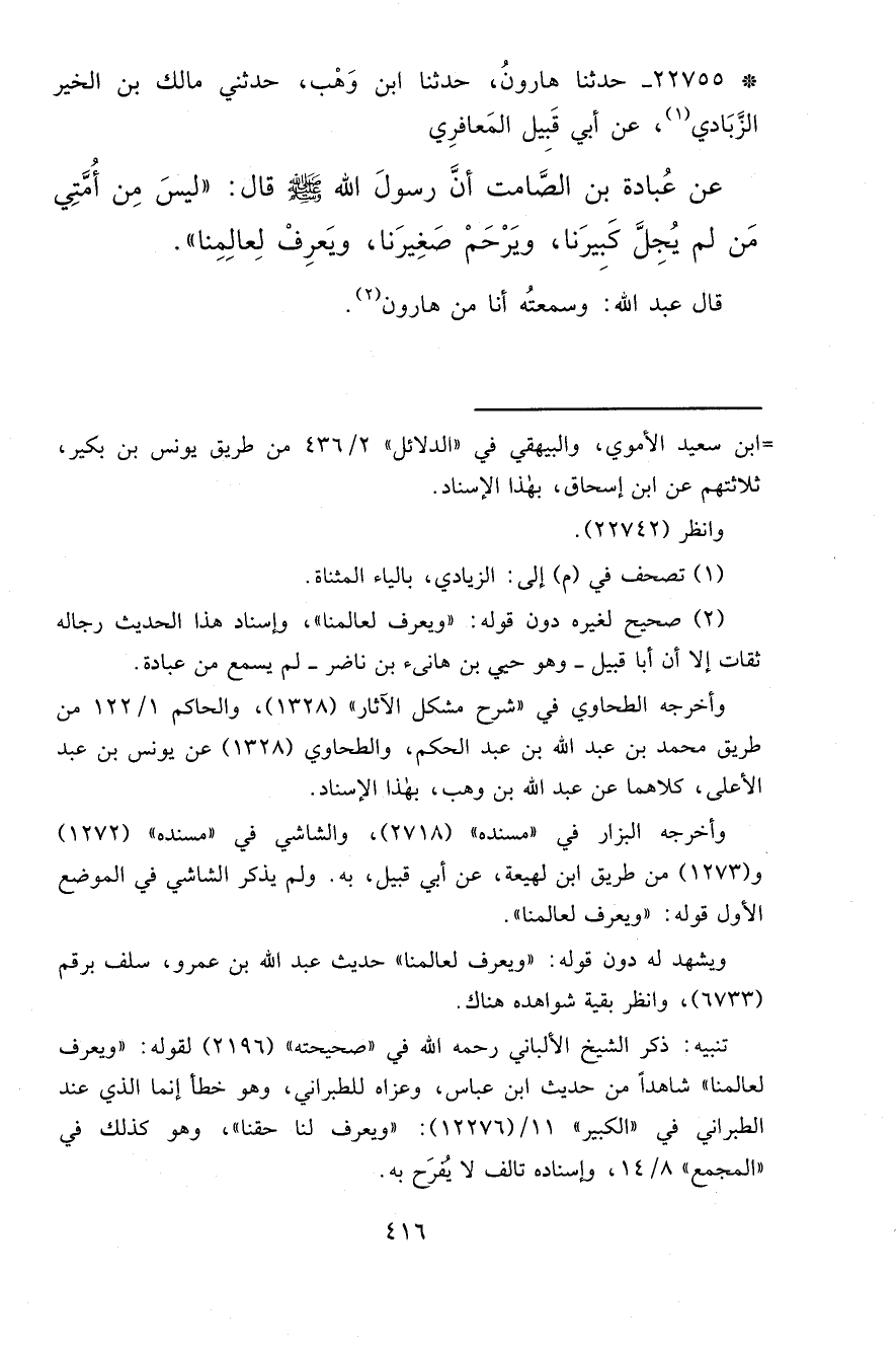 * ٢٢٧٥٥ - حَدَّثَنَا هَارُونُ، حَدَّثَنَا ابْنُ وَهْبٍ، حَدَّثَنِي مَالِكُ بْنُ الْخَيْرِ الزِّبَادِيُّ (١) ، عَنْ أَبِي قَبِيلٍ الْمَعَافِرِيِّ، عَنْ عُبَادَةَ بْنِ الصَّامِتِ، أَنَّ رَسُولَ اللهِ صَلَّى اللهُ عَلَيْهِ وَسَلَّمَ قَالَ: " لَيْسَ مِنْ أُمَّتِي مَنْ لَمْ يُجِلَّ كَبِيرَنَا، وَيَرْحَمْ صَغِيرَنَا، وَيَعْرِفْ لِعَالِمِنَا " قَالَ عَبْدُ اللهِ: وَسَمِعْتُهُ أَنَا مِنْ هَارُونَ (٢)